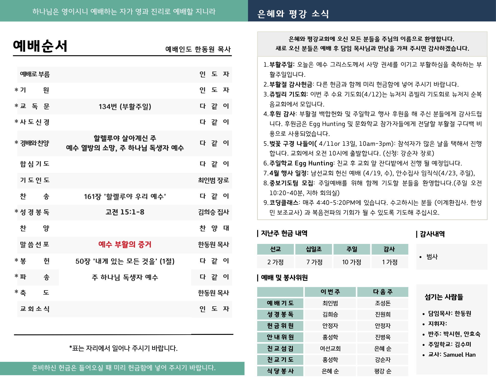 - 부활절 감사헌금: 다른 헌금과 함께 미리 헌금함에 넣어 주시기 바랍니다.