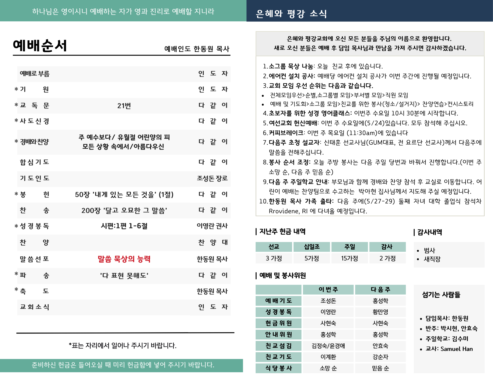 - 한동원 목사 가족 출타: 다음 주에(5/27-29) 둘째 자녀 대학 졸업식 참석차 Rrovidene, RI 에 다녀올 예정입니다.