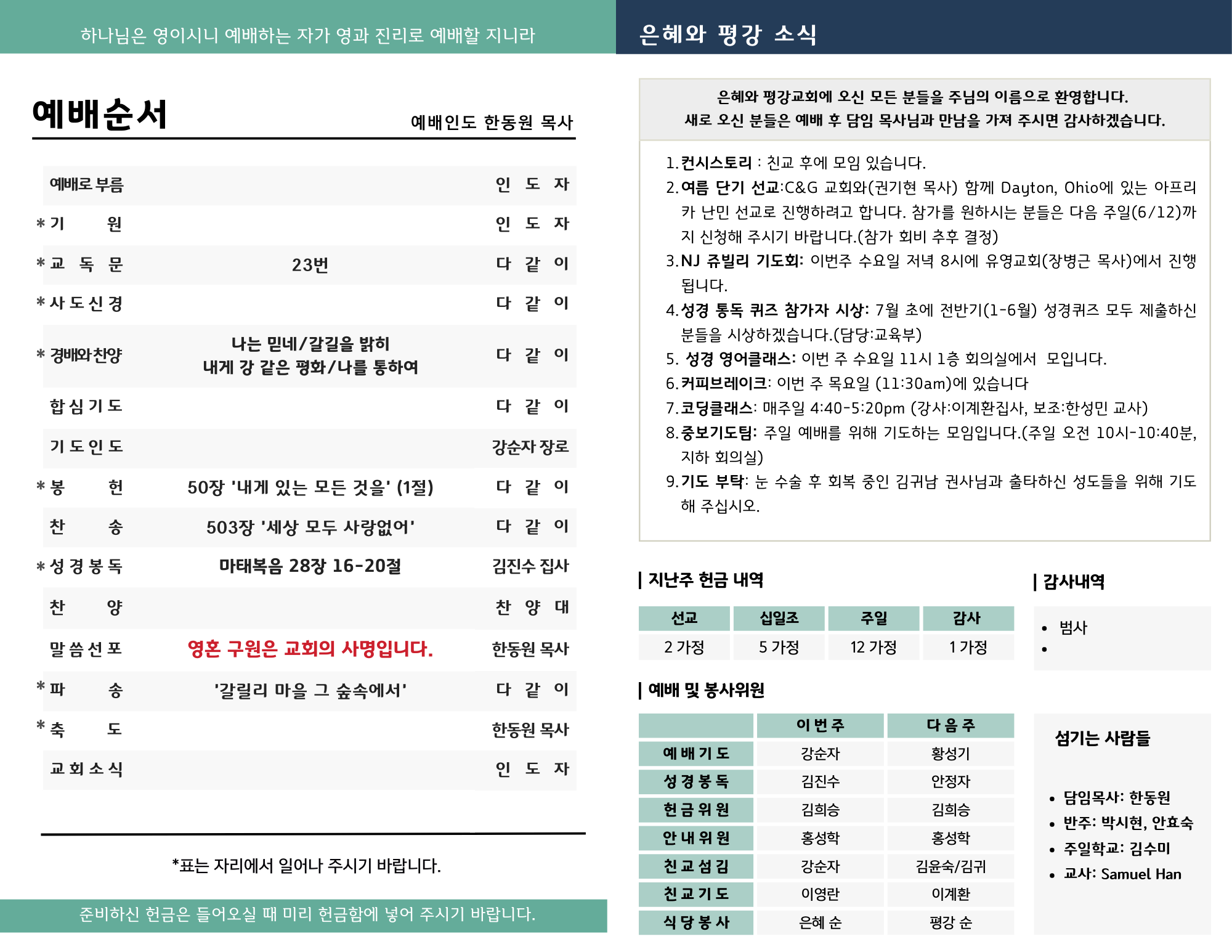 - 성경 통독 퀴즈 참가자 시상: 7월 초에 전반기(1-6월) 성경퀴즈 모두 제출하신 분들을 시상하겠습니다.(담당:교육부)