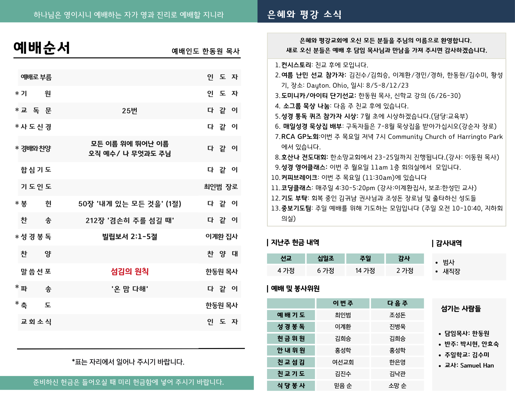 • 기도 부탁: 회복 중인 김귀남 권사님과 조성돈 장로님 및 출타하신 성도들