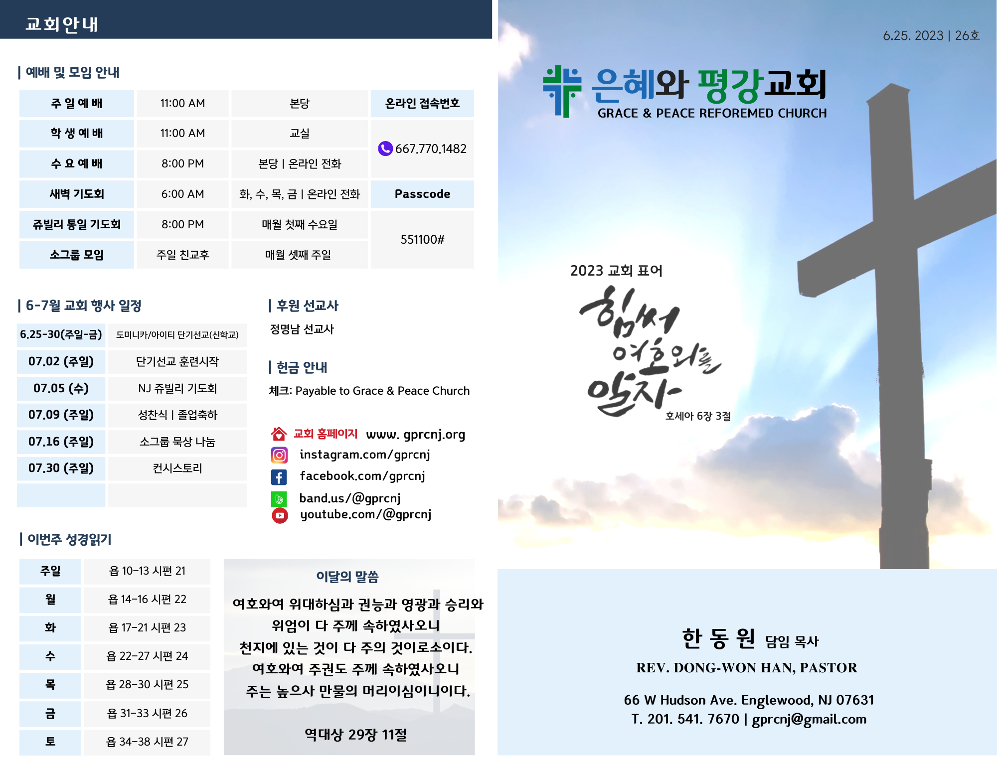 4. 주중 일정: 새벽 기도회 정상 진행, 수요 기도회 및 성경 영어클래스는 없습니다.