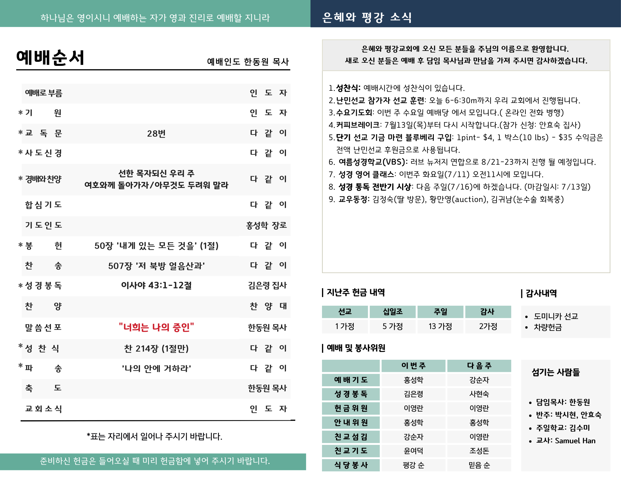 - 성경 통독 전반기 시상: 다음 주일(7/16)에 하겠습니다. (마감일시: 7/13일)
