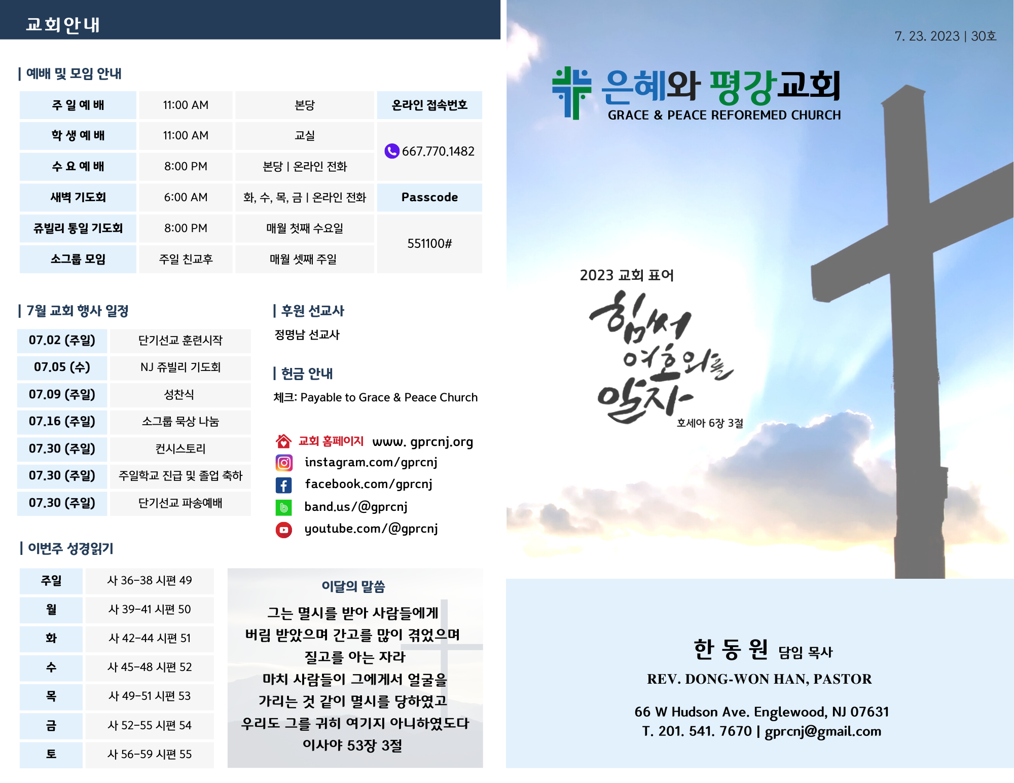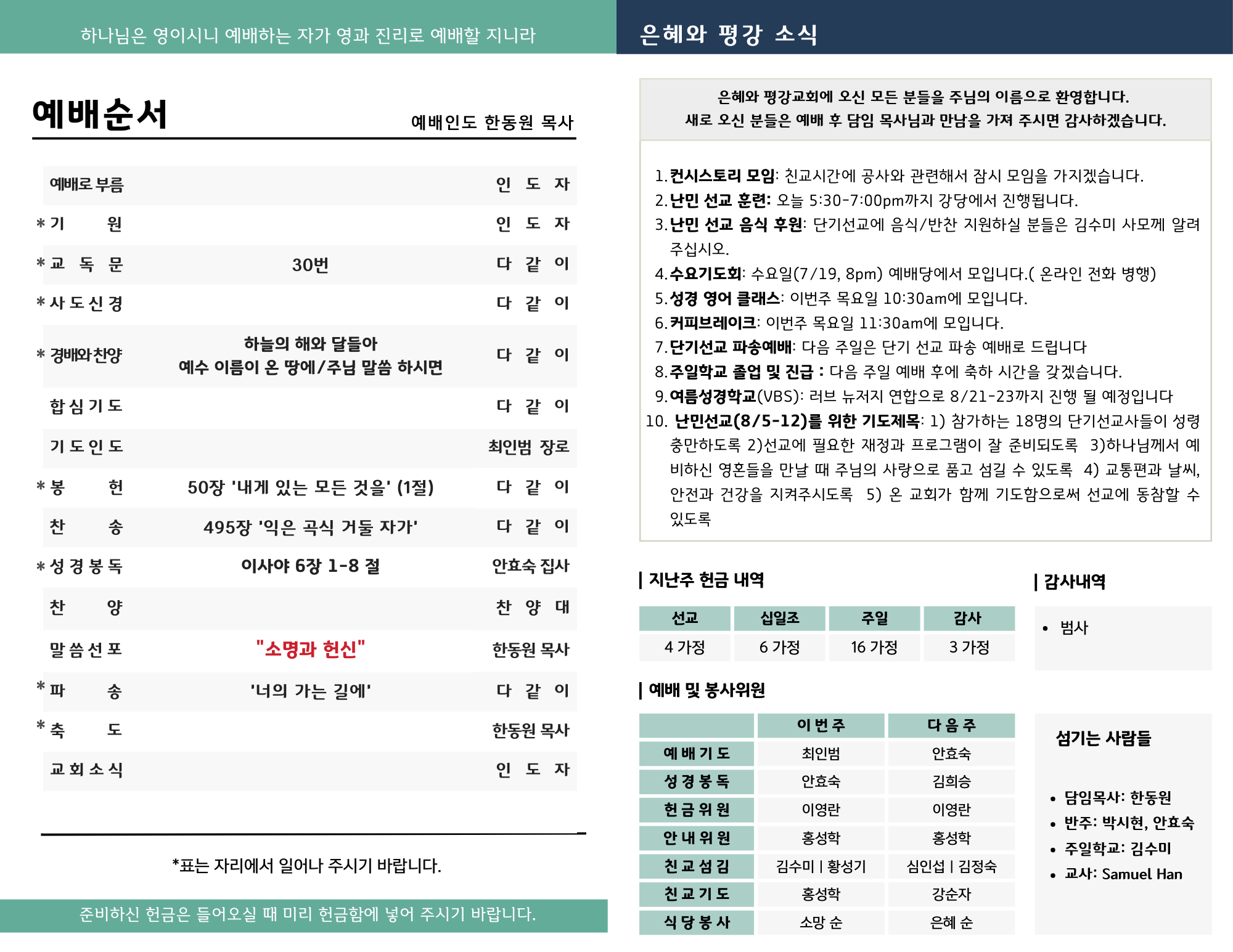 - 수요기도회: 수요일(7/19, 8pm) 예배당에서 모입니다.( 온라인 전화 병행)