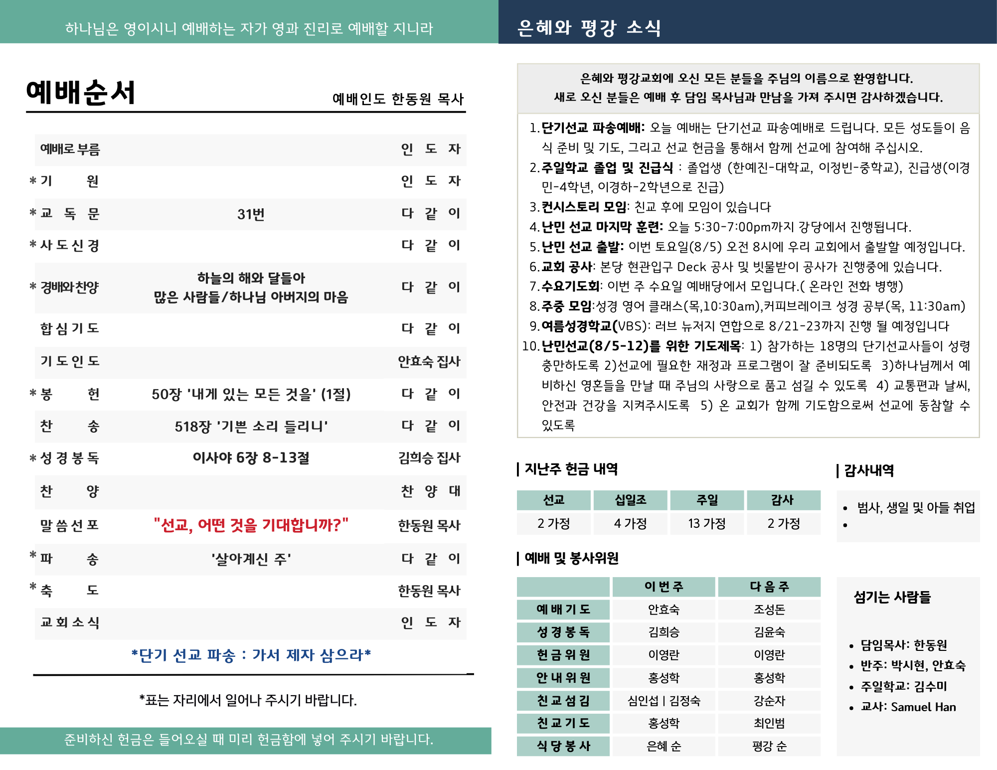 - 단기선교 파송예배: 오늘 예배는 단기선교 파송예배로 드립니다. 모든 성도들이 음식 준비 및 기도, 그리고 선교 헌금을 통해서 함께 선교에 참여해 주십시오.