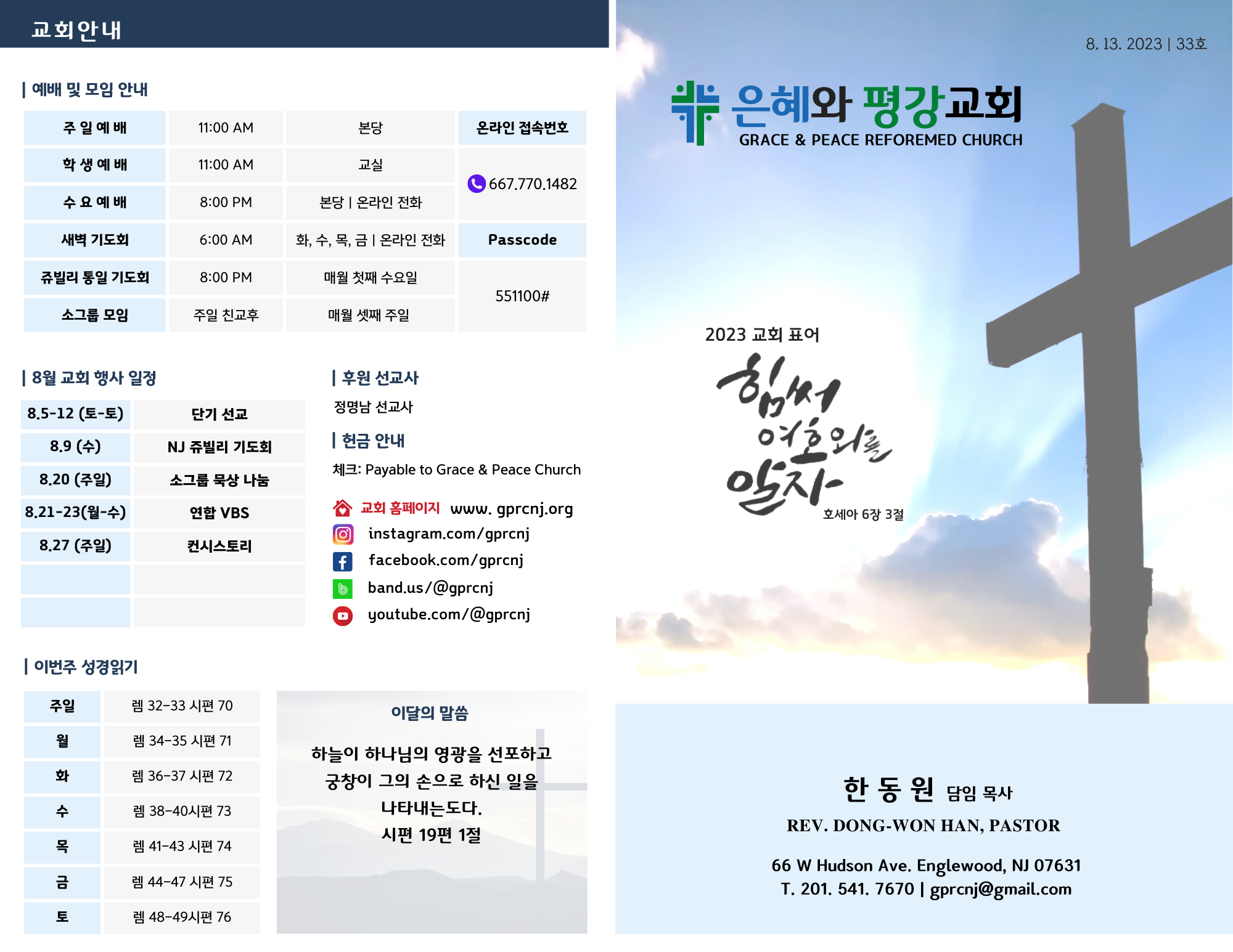 - 수요 기도회: 수요일 저녁 8시에 예배당과 온라인 전화로 드립니다.