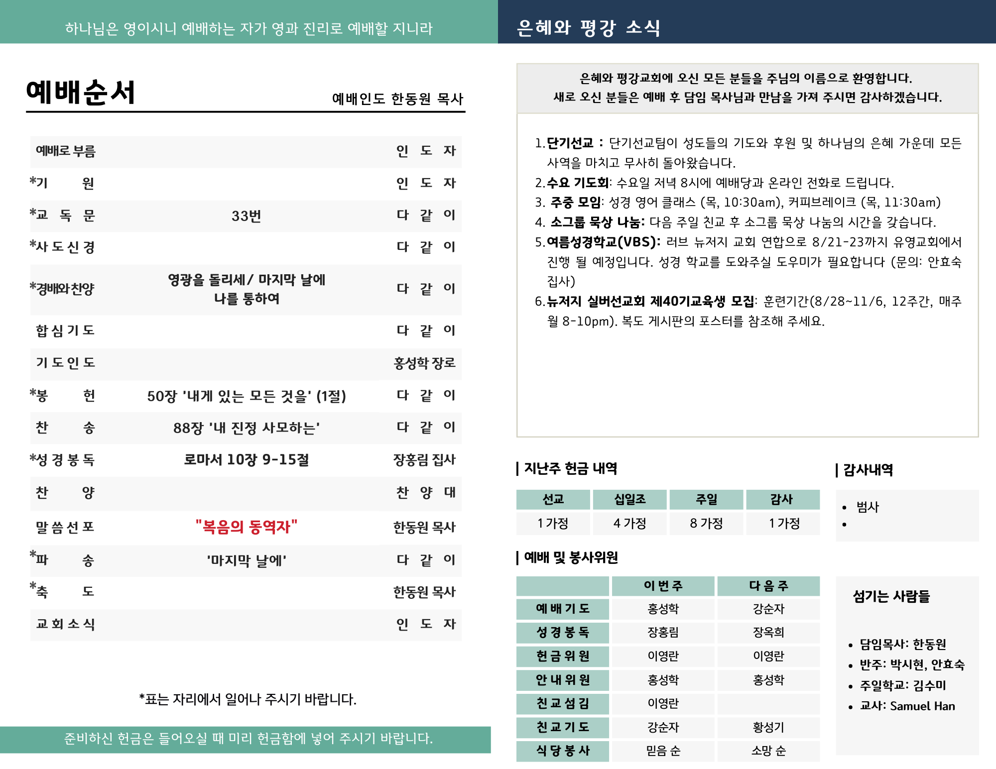 - 여름성경학교(VBS): 러브 뉴저지 교회 연합으로 8/21-23까지 유영교회에서 진행 될 예정입니다. 성경 학교를 도와주실 도우미가 필요합니다 (문의: 안효숙 집사)