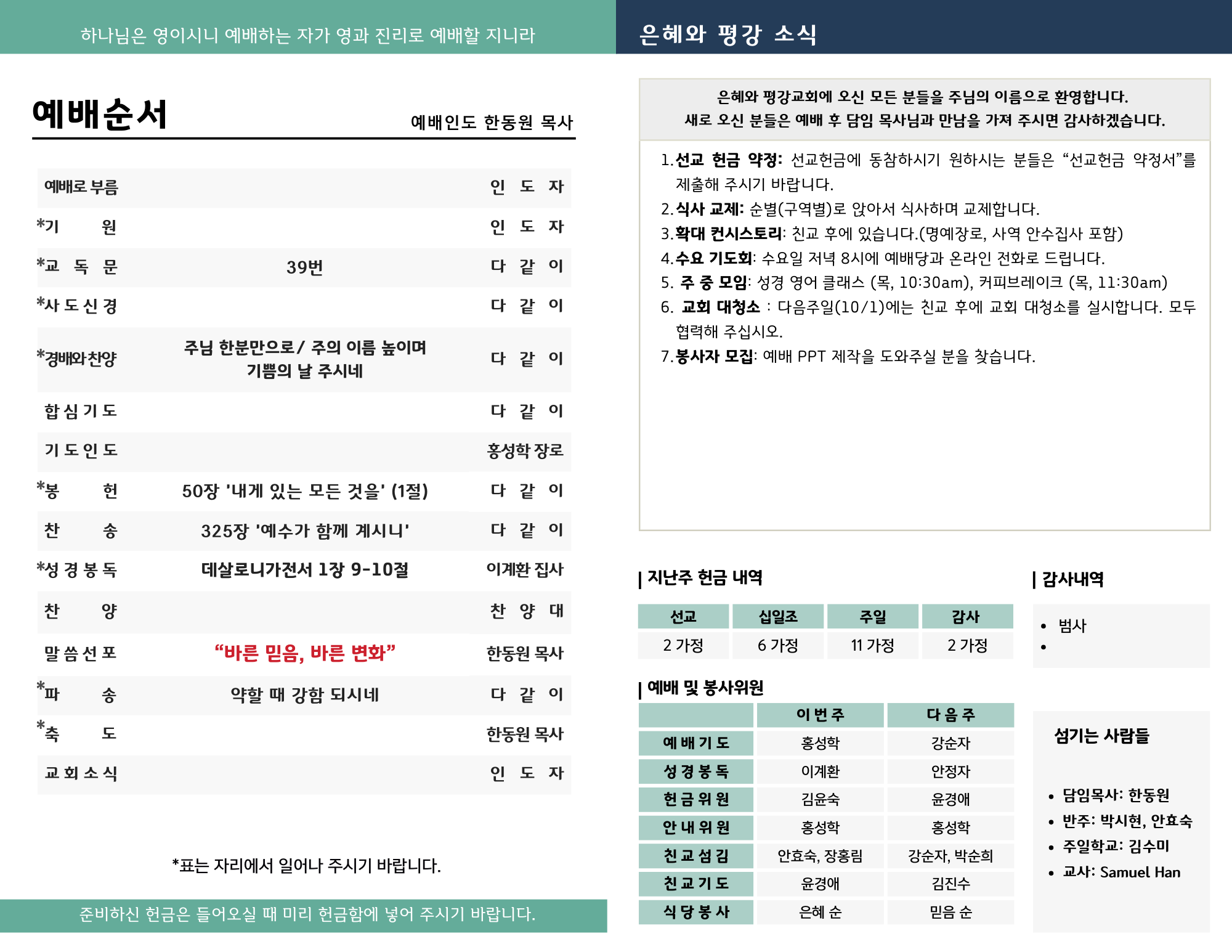 - 교회 대청소 : 다음주일(10/1)에는 친교 후에 교회 대청소를 실시합니다. 모두 협력해 주십시오.