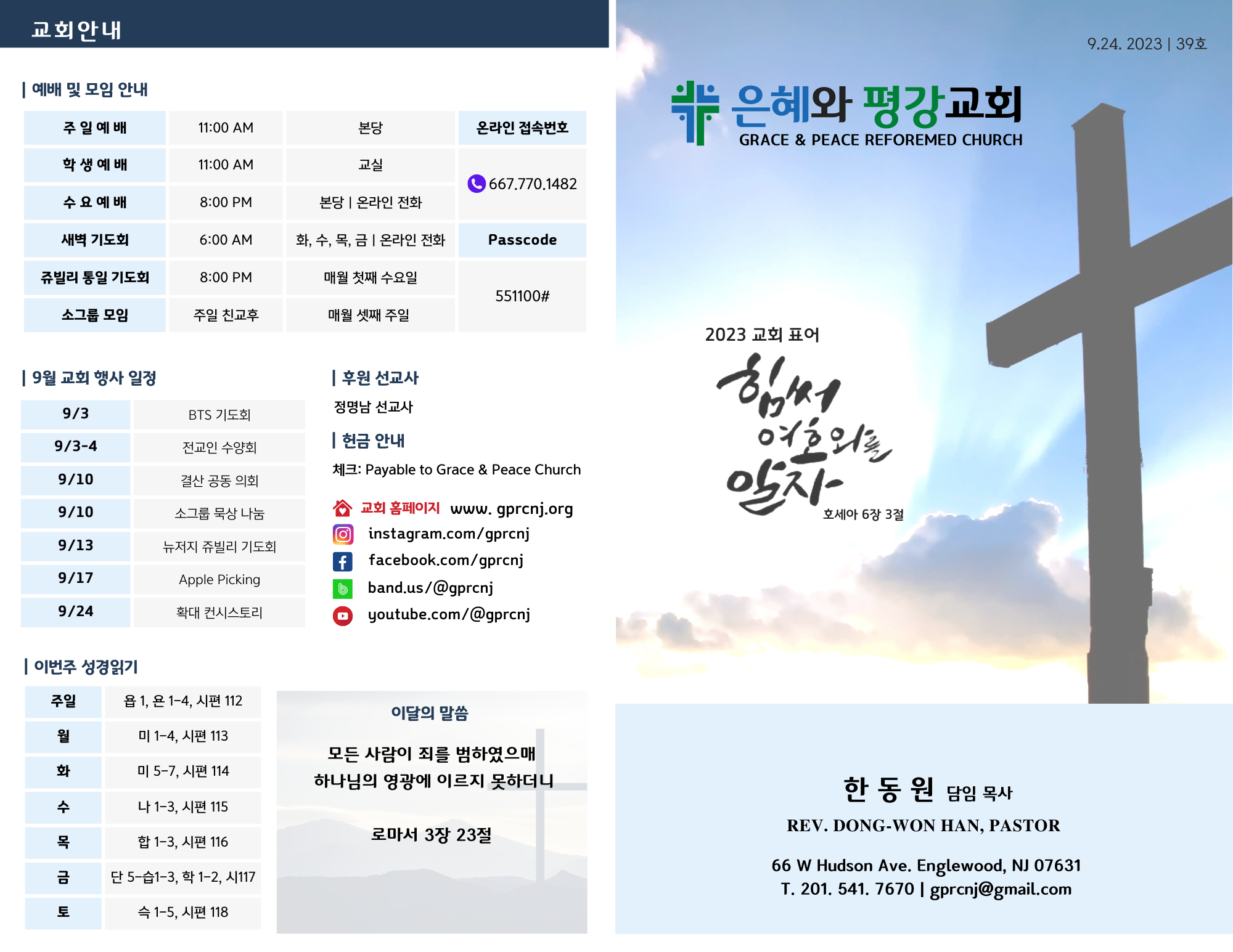 - 수요 기도회: 수요일 저녁 8시에 예배당과 온라인 전화로 드립니다.