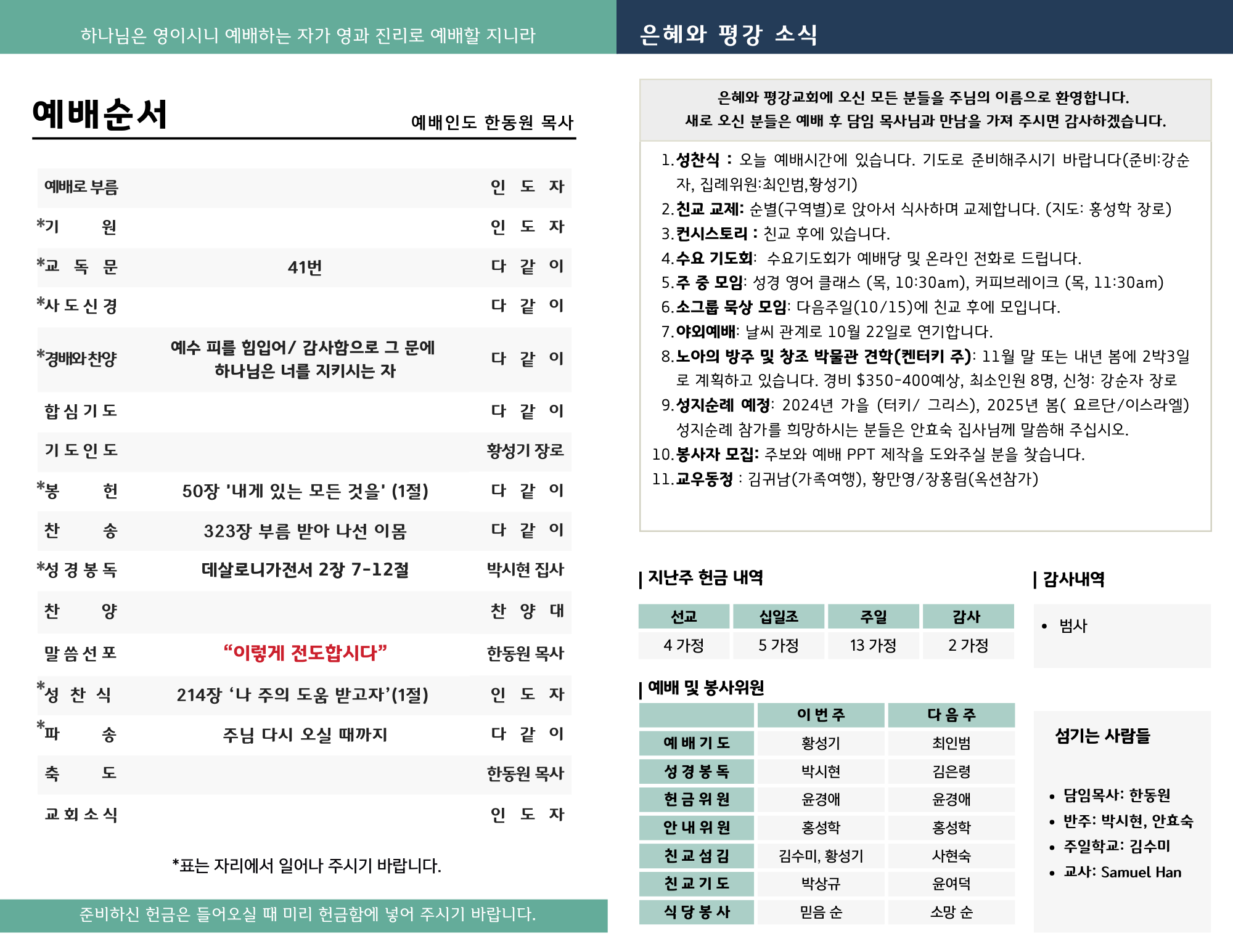 - 봉사자 모집: 주보와 예배 PPT 제작을 도와주실 분을 찾습니다.