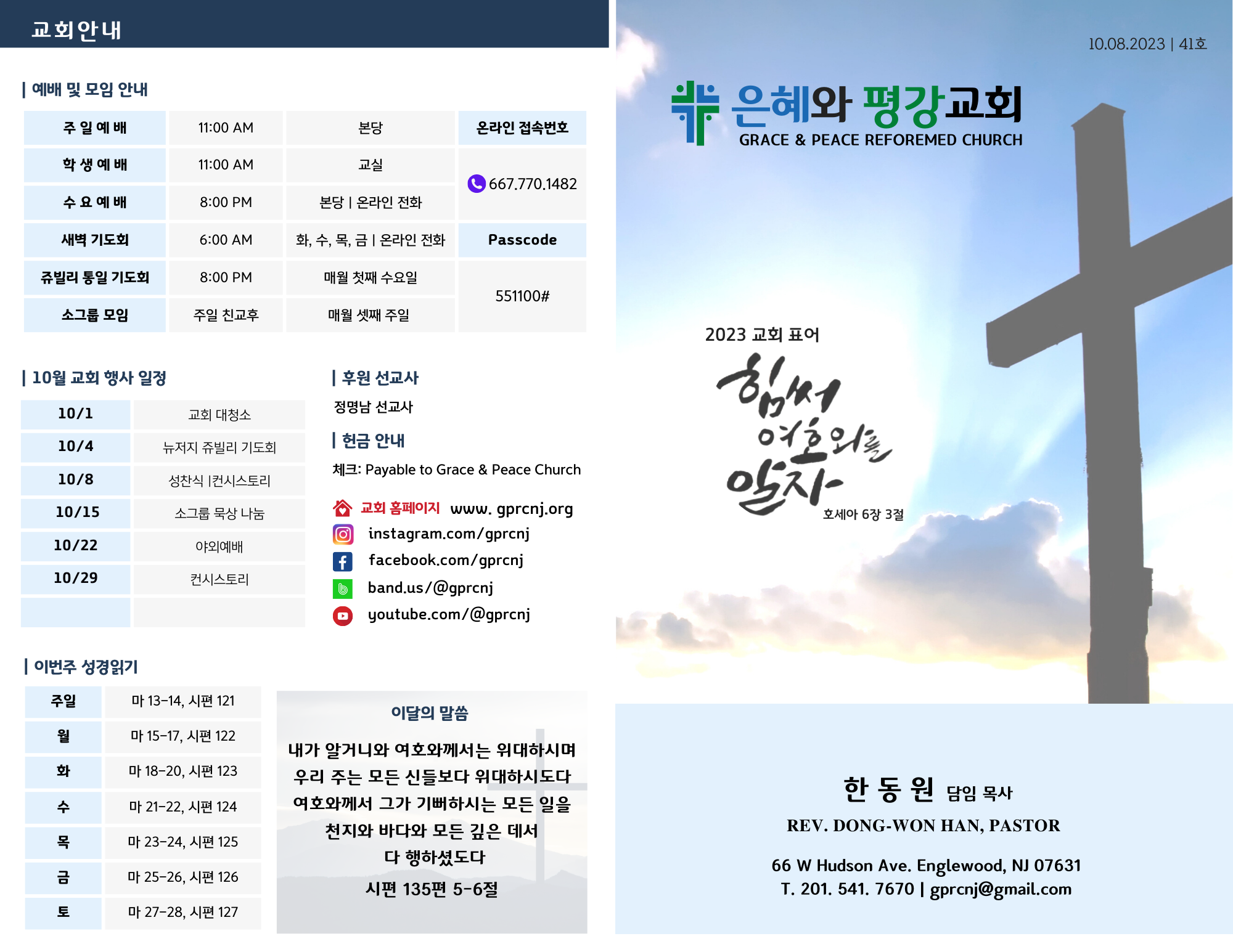 • 수요 기도회: 수요기도회가 예배당 및 온라인 전화로 드립니다.