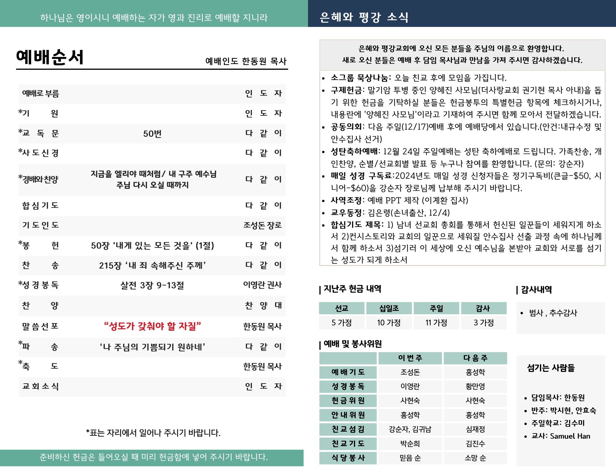 • 공동의회: 다음 주일(12/17)예배 후에 예배당에서 있습니다.(안건:내규수정 및 안수집사 선거)