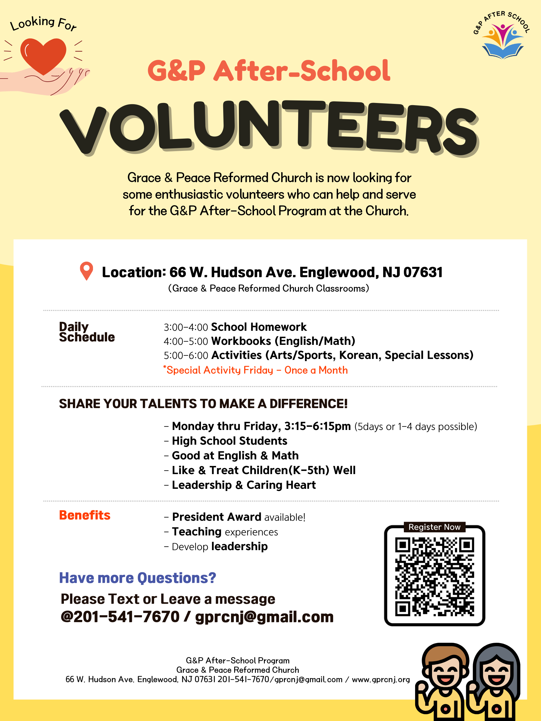 Grace & Peace Reformed Church is now looking for some enthusiastic volunteers who can help and serve for the G&P After-School Program at the Church.