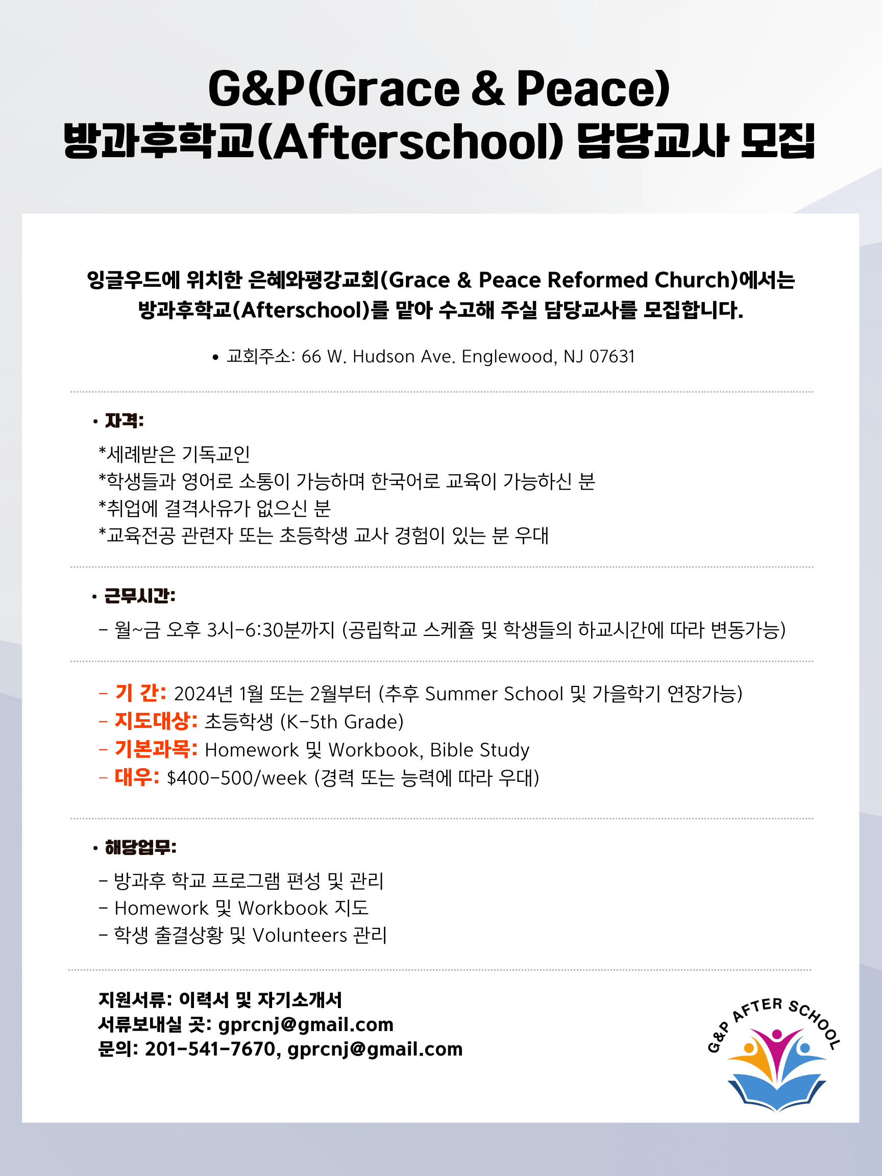잉글우드에 위치한 은혜와평강교회(Grace & Peace Reformed Church)에서는 방과후 학교(Afterschool)를 맡아 수고해 주실 담당교사를 모집합니다.