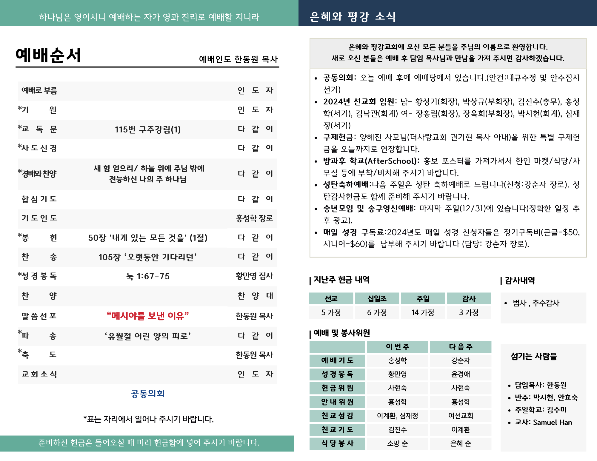 - 매일 성경 구독료:2024년도 매일 성경 신청자들은 정기구독비(큰글-$50, 시니어-$60)를 납부해 주시기 바랍니다 (담당: 강순자 장로)