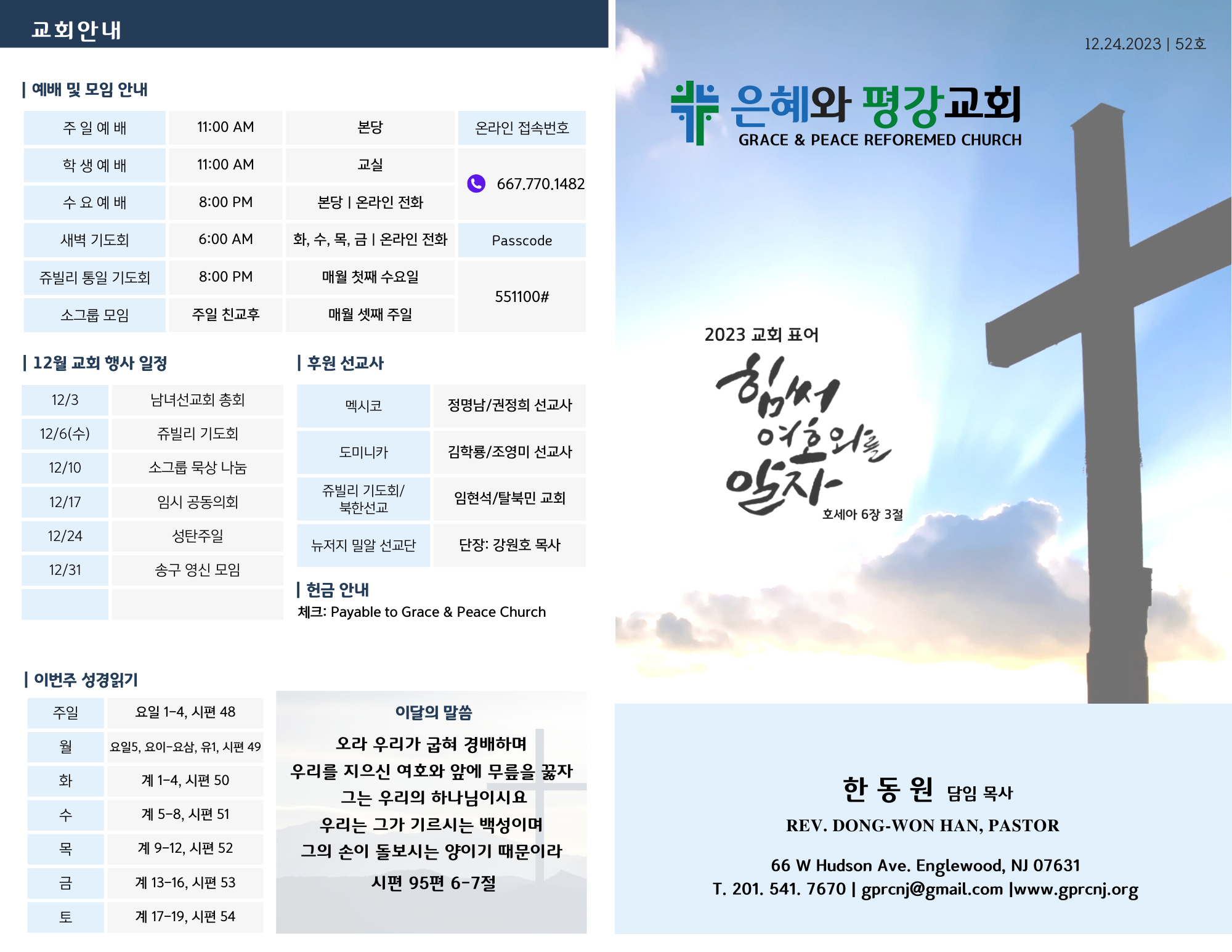 - 송년 모임 및 송구영신 예배: 다음 주일 오후 4시부터 송년 모임이 남선교회 주관으로 진행되고, 저녁 식사 후 송구영신 예배(8시)가 있습니다.