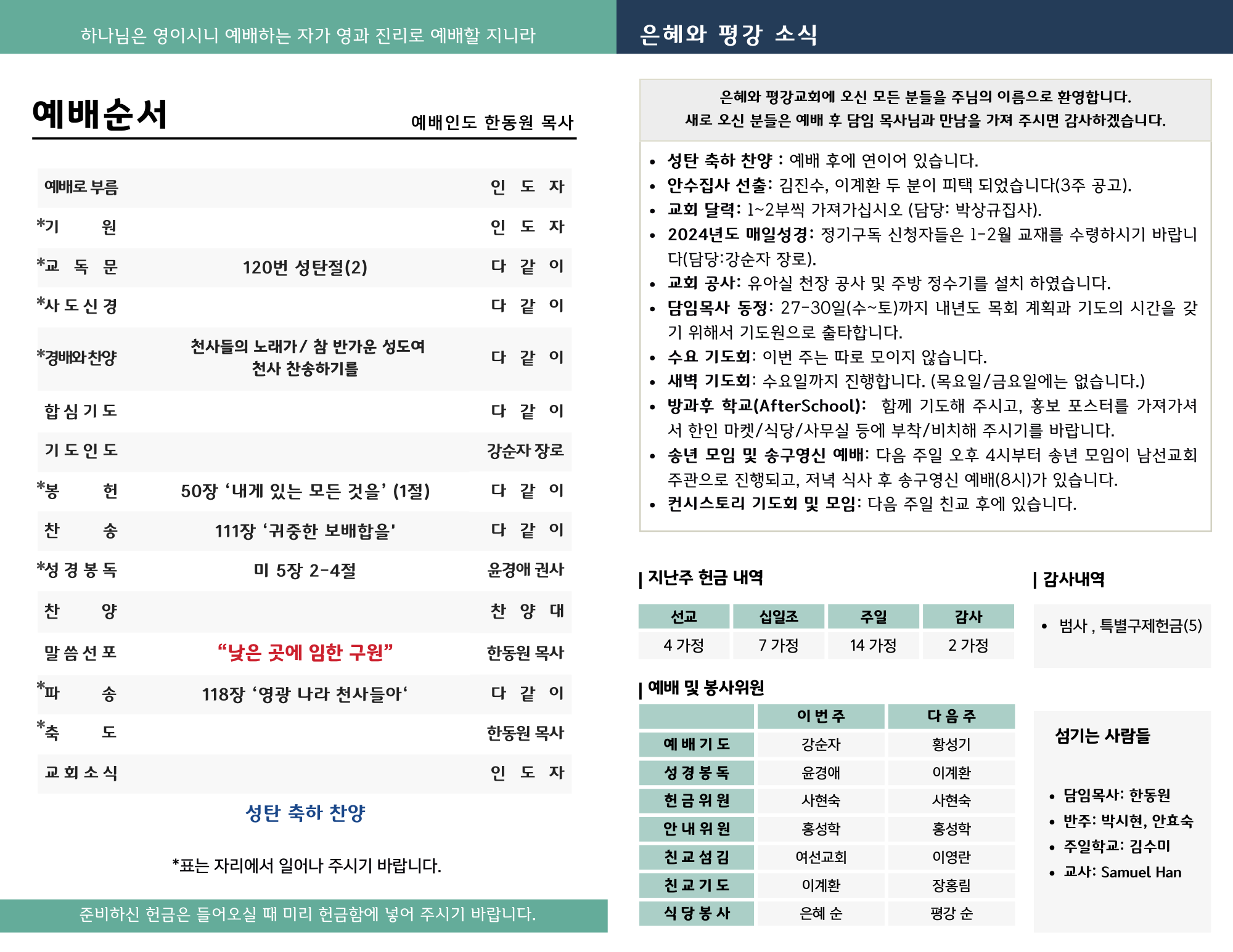 - 성탄 축하 찬양 : 예배 후에 연이어 있습니다.