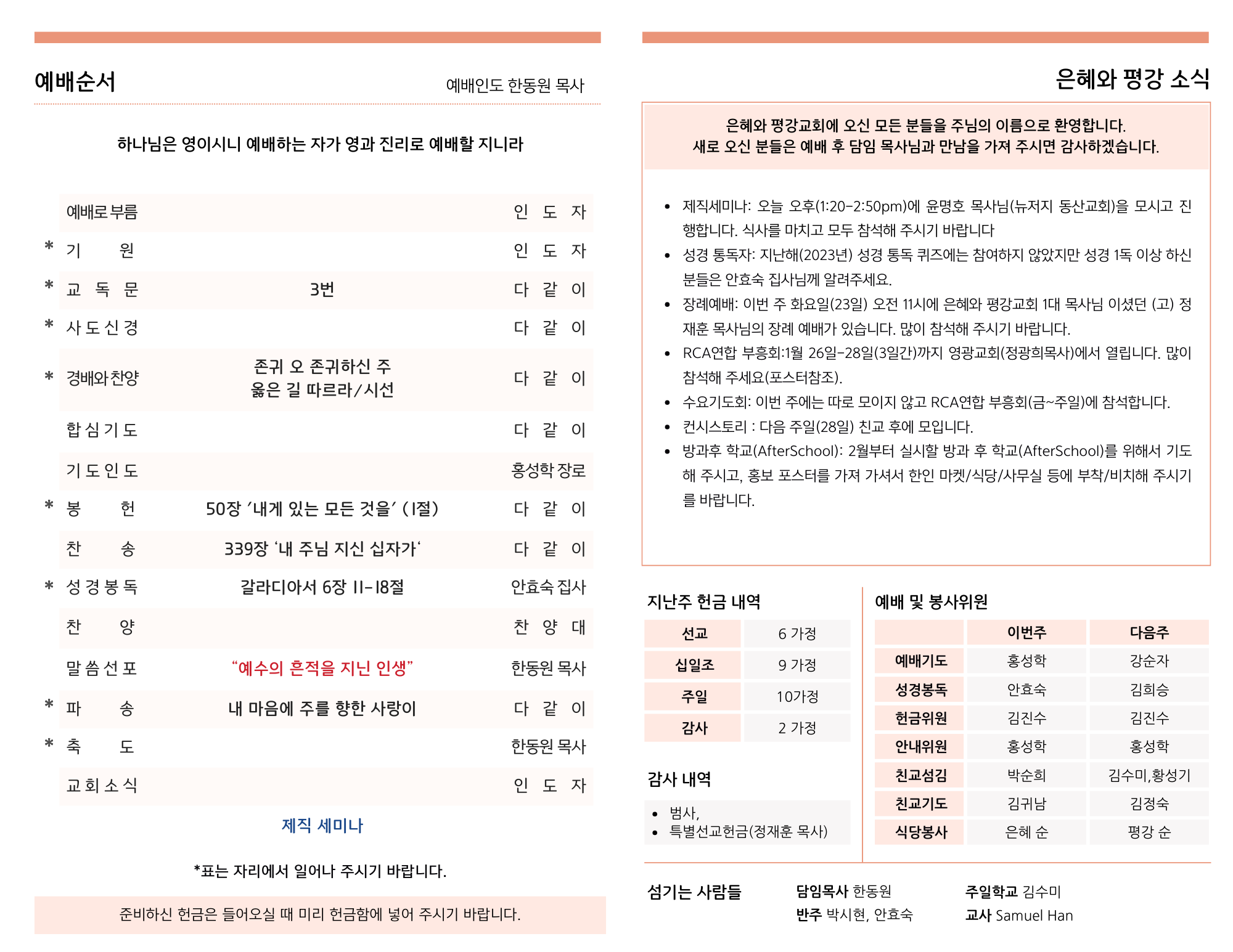• 성경 통독자: 지난해(2023년) 성경 통독 퀴즈에는 참여하지 않았지만 성경 1독 이상 하신 분들은 안효숙 집사님께 알려주세요.