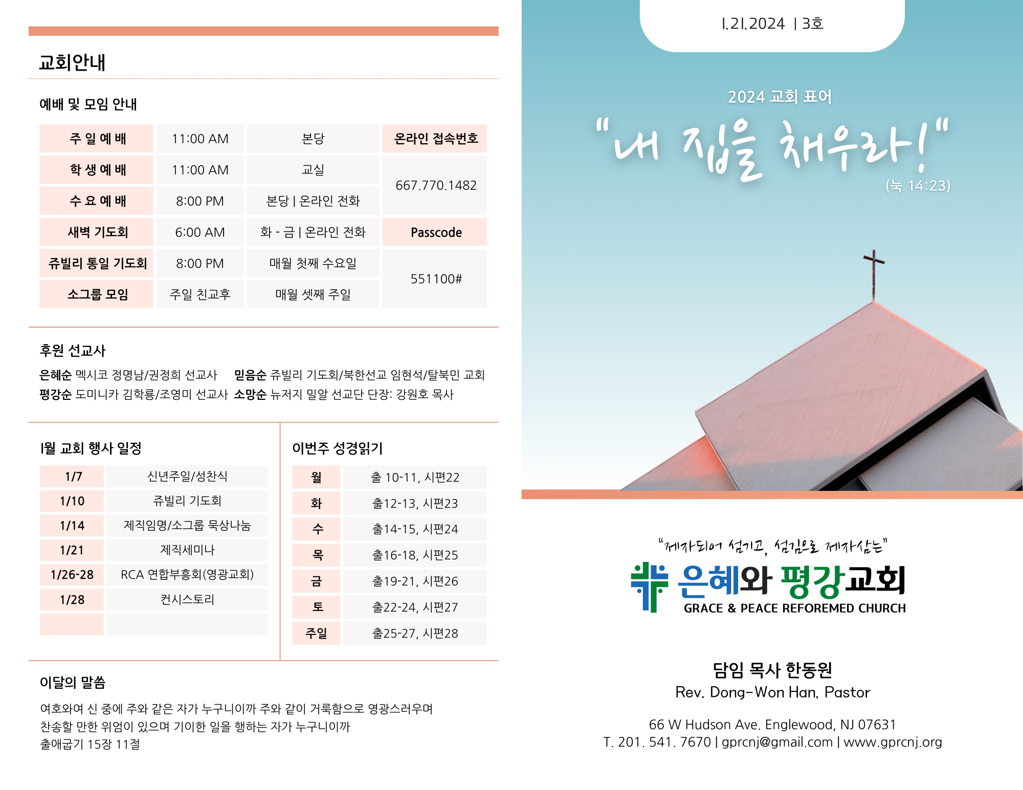 • 장례예배: 이번 주 화요일(23일) 오전 11시에 은혜와 평강교회 1대 목사님 이셨던 (고) 정재훈 목사님의 장례 예배가 있습니다. 많이 참석해 주시기 바랍니다.