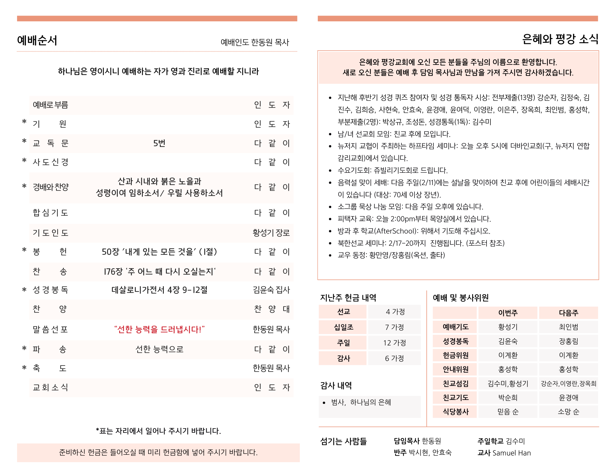 - 음력설 맞이 세배: 다음 주일(2/11)에는 설날을 맞이하여 친교 후에 어린이들의 세배시간이 있습니다 (대상: 70세 이상 장년).