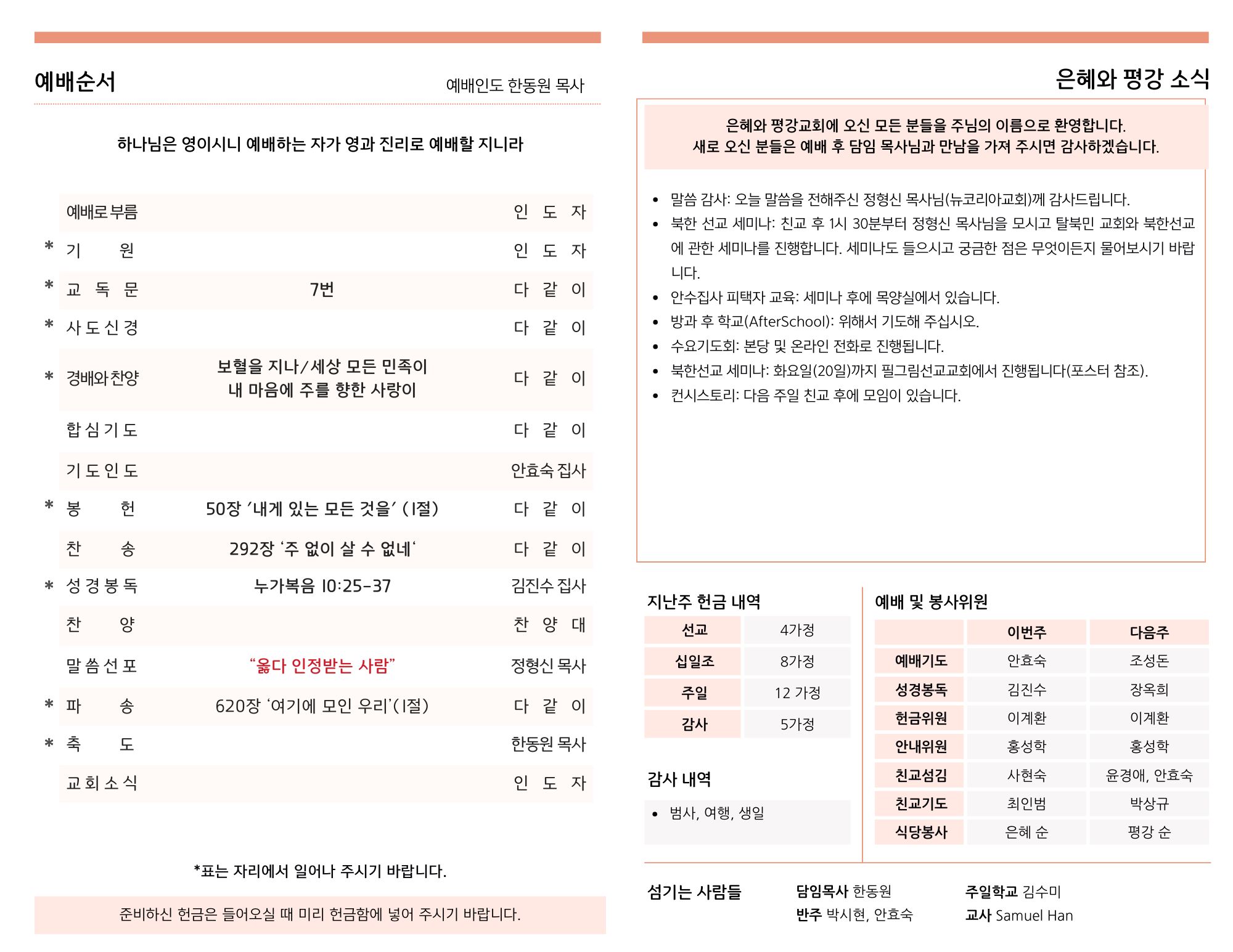 - 말씀 감사: 오늘 말씀을 전해주신 정형신 목사님(뉴코리아교회)께 감사드립니다.
