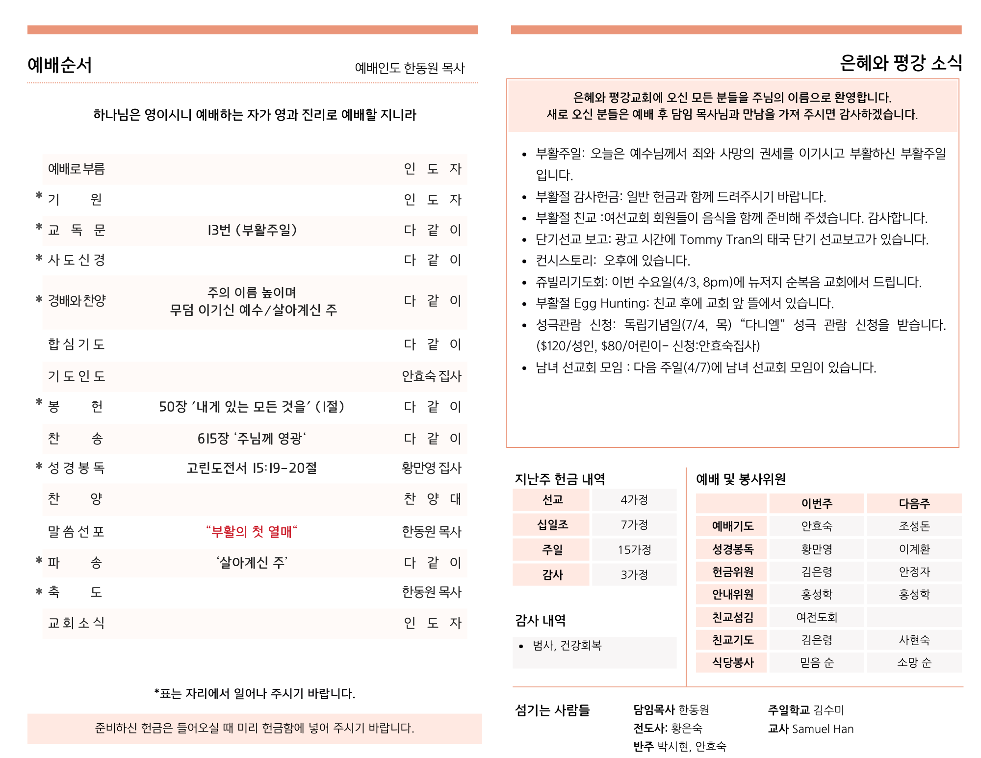 - 부활절 감사헌금: 일반 헌금과 함께 드려주시기 바랍니다.