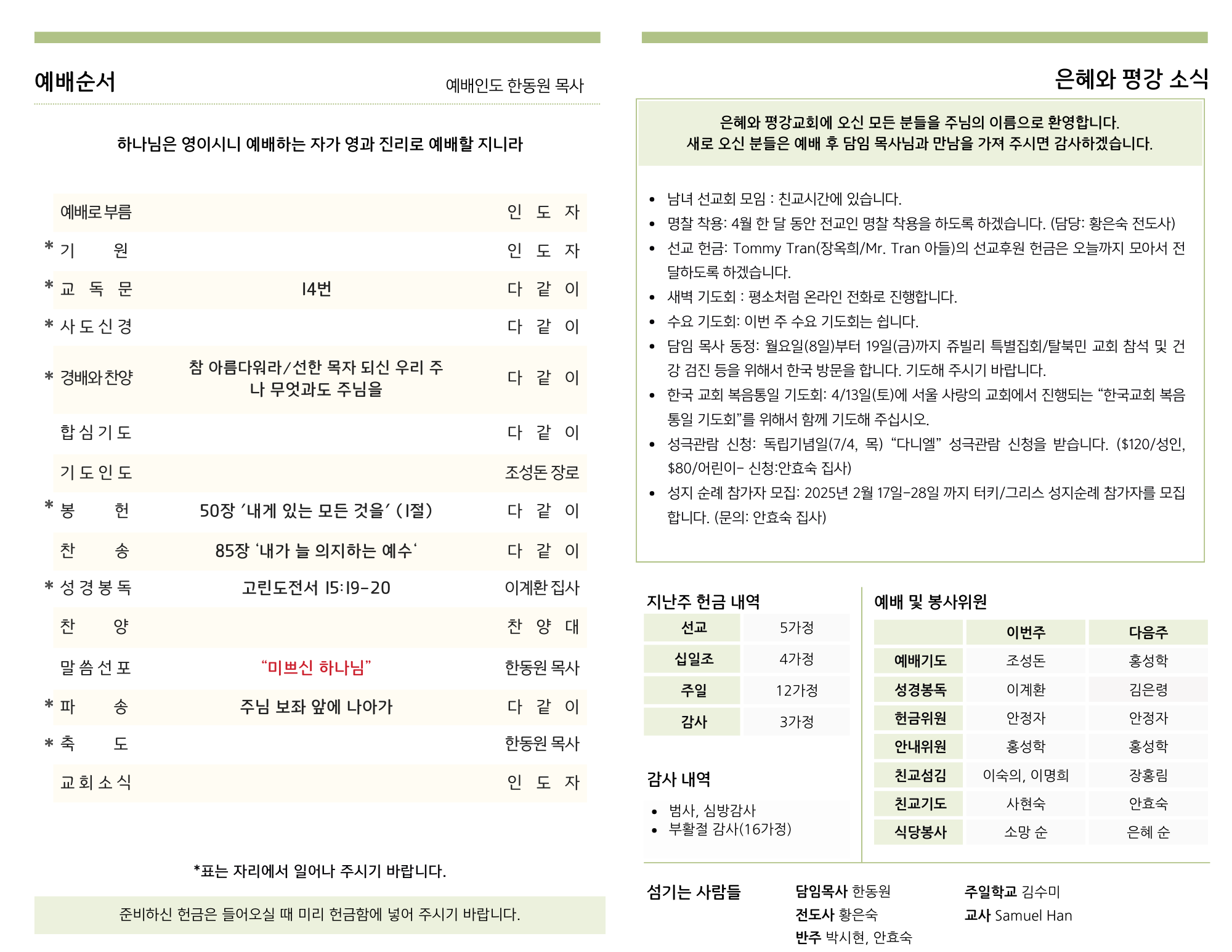 • 담임 목사 동정: 월요일(8일)부터 19일(금)까지 쥬빌리 특별집회/탈북민 교회 참석 및 건강 검진 등을 위해서 한국 방문을 합니다. 기도해 주시기 바랍니다.