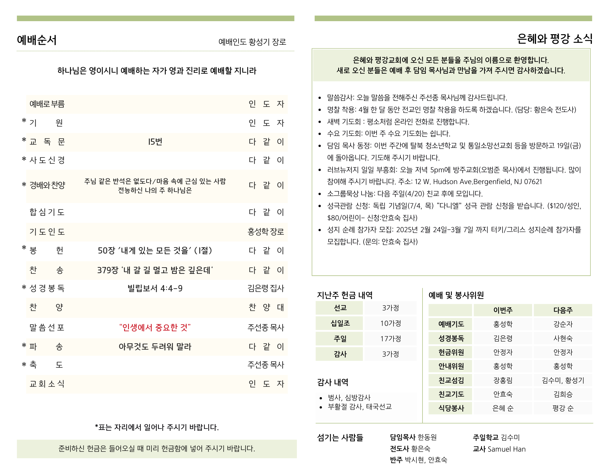 - 말씀감사: 오늘 말씀을 전해주신 주선종 목사님께 감사드립니다
