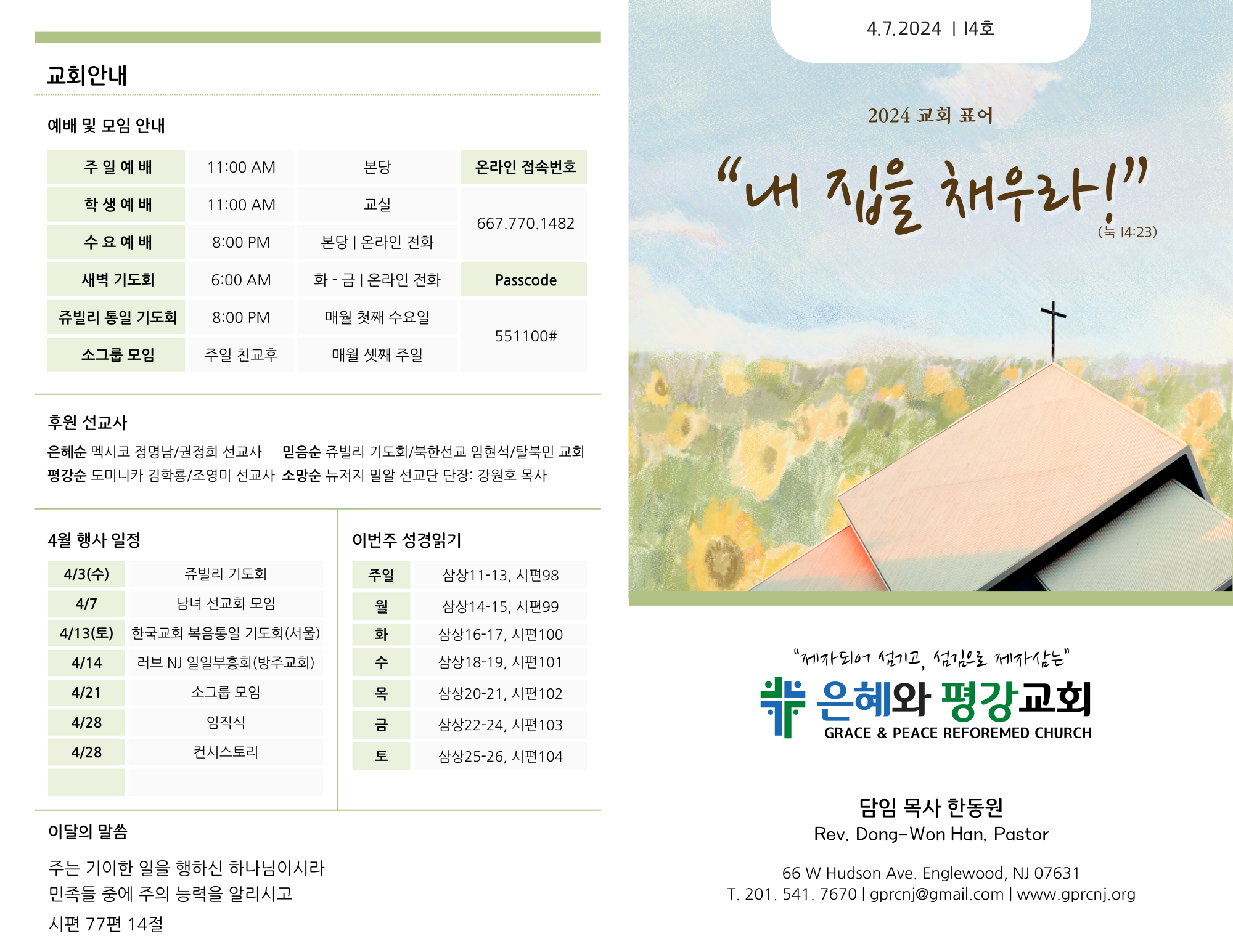 - 소그룹묵상 나눔: 다음 주일(4/20) 친교 후에 모입니다.