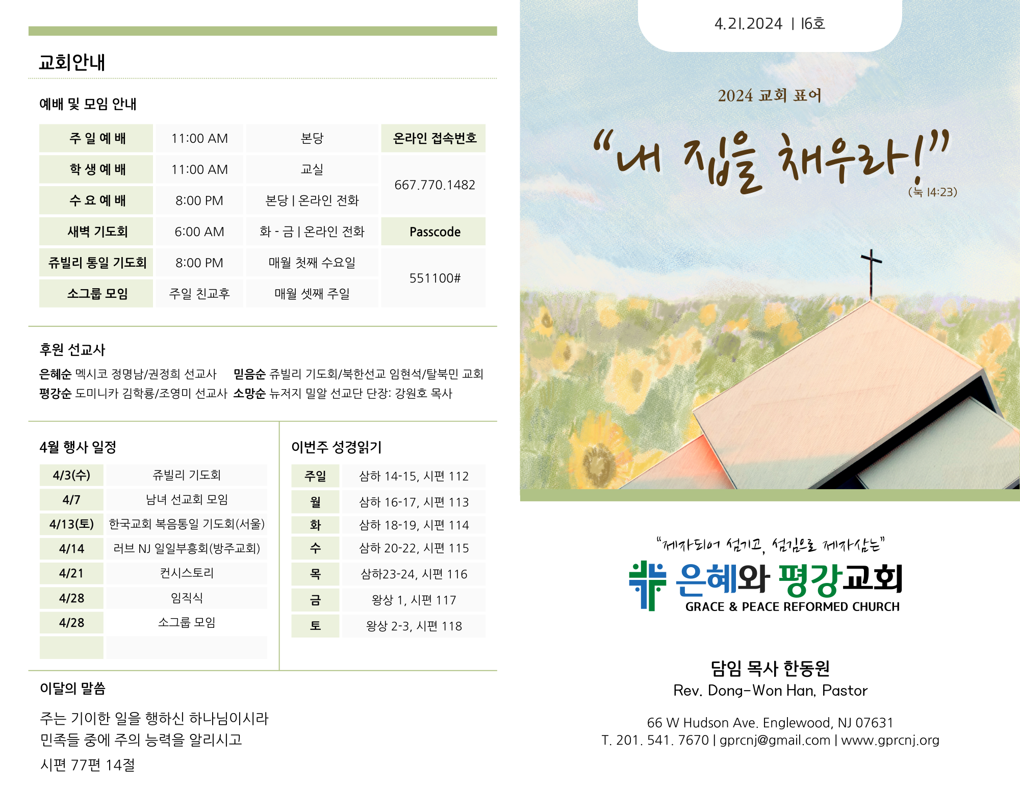 - 임직식 및 은퇴식: 다음 주일(4/20) 예배 직후에 안수집사/명예권사 임직식 및 장로 은퇴식이 예배당에서 바로 진행됩니다.
