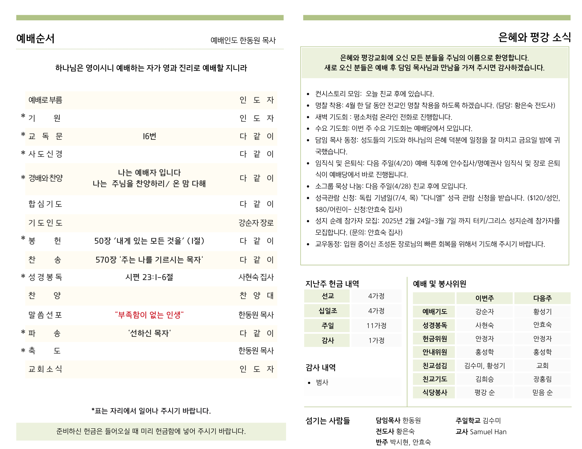 - 담임 목사 동정: 성도들의 기도와 하나님의 은혜 덕분에 일정을 잘 마치고 금요일 밤에 귀국했습니다.