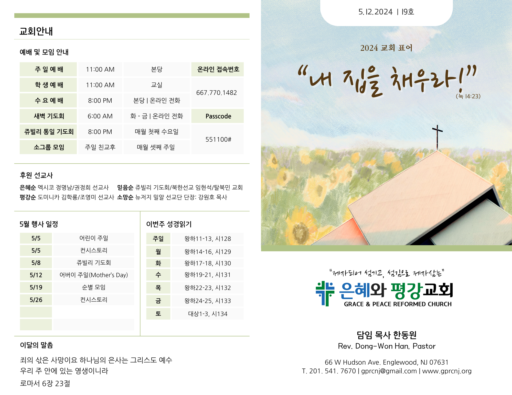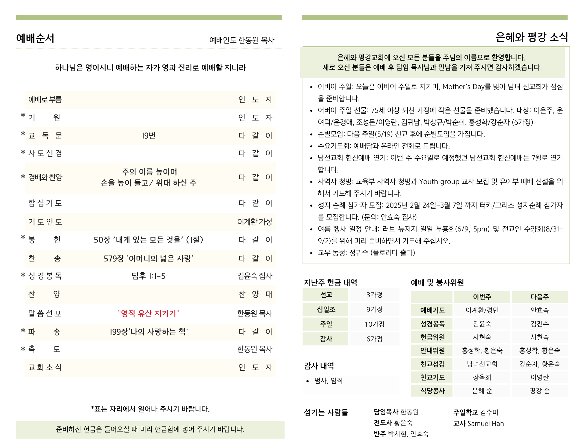 - 어버이 주일: 오늘은 어버이 주일로 지키며, Mother’s Day를 맞아 남녀 선교회가 점심을 준비합니다.