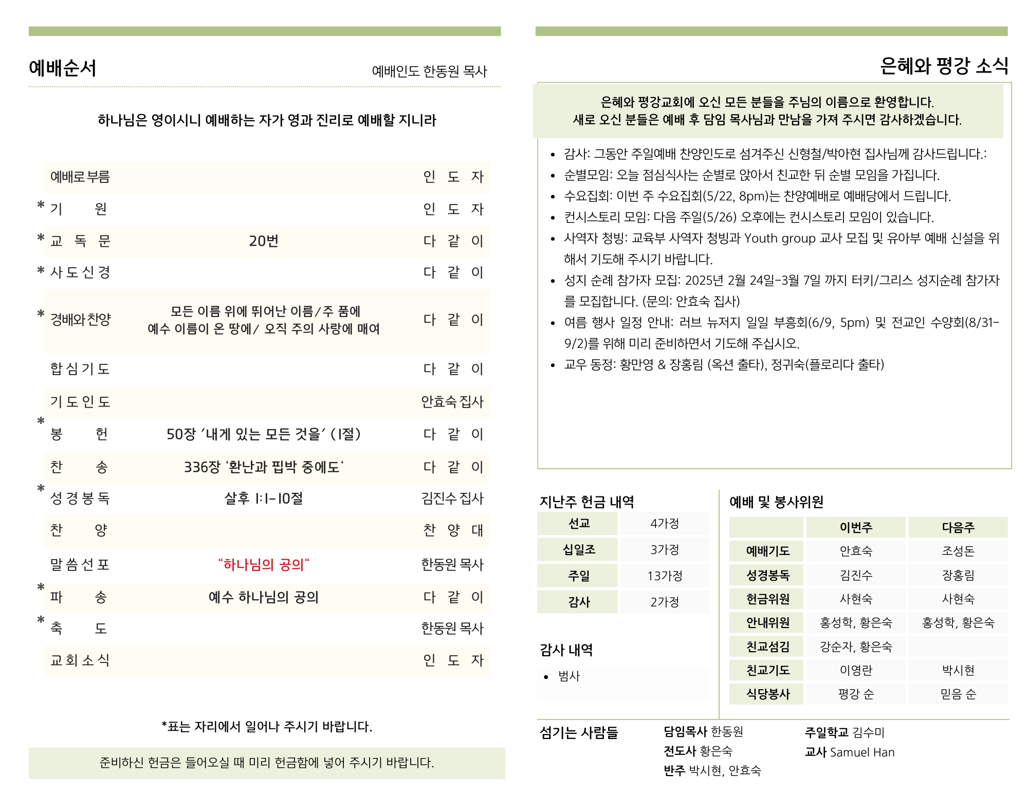 - 감사: 그동안 주일예배 찬양인도로 섬겨주신 신형철/박아현 집사님께 감사드립니다.: