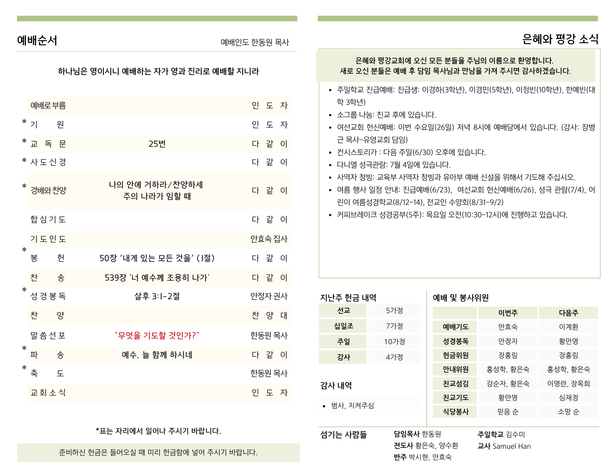 - 여름 행사 일정 안내: 진급예배(6/23), 여선교회 헌신예배(6/26), 성극 관람(7/4), 어린이 여름성경학교(8/12-14), 전교인 수양회(8/31-9/2)