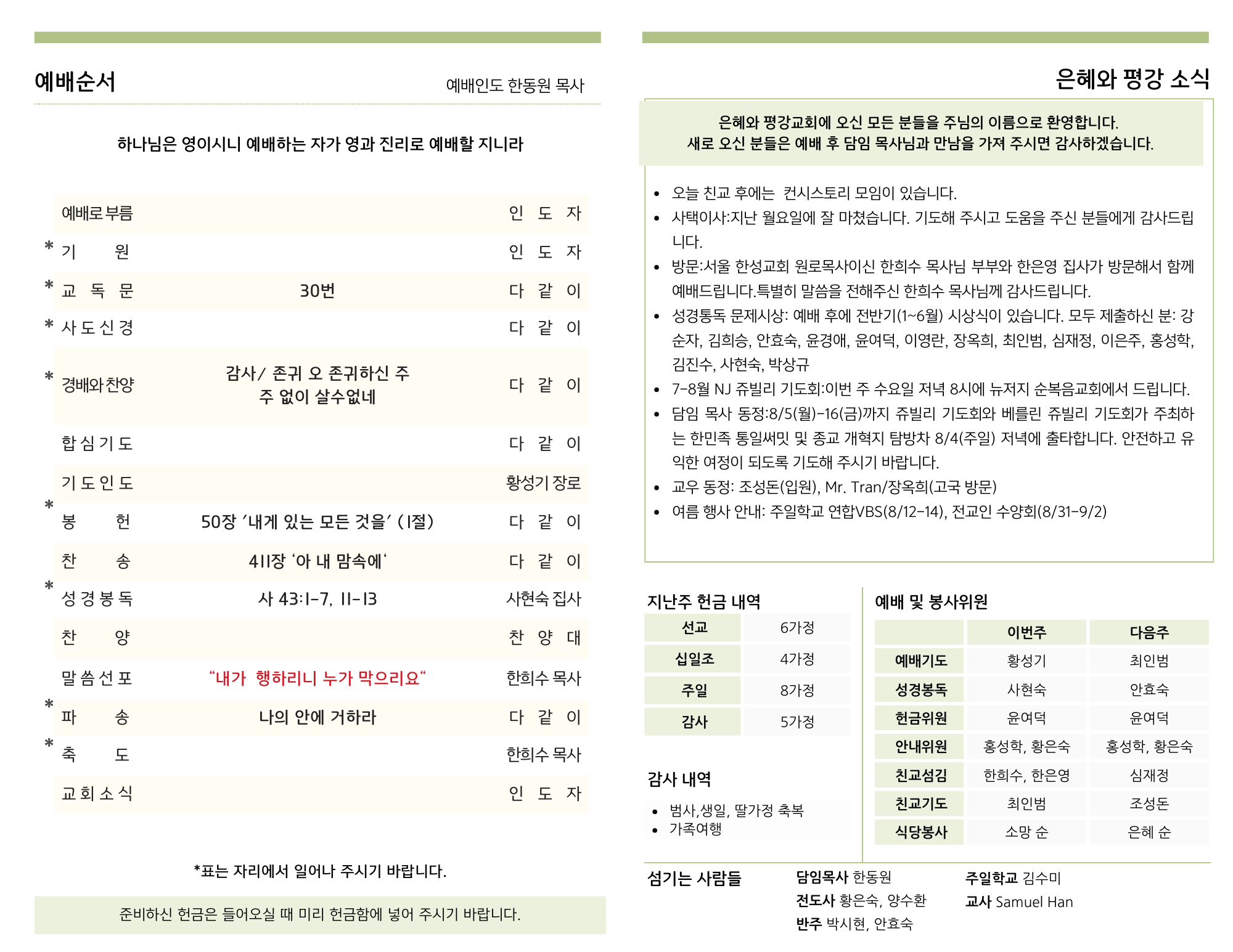 - 여름 행사 안내: 주일학교 연합VBS(8/12-14), 전교인 수양회(8/31-9/2)