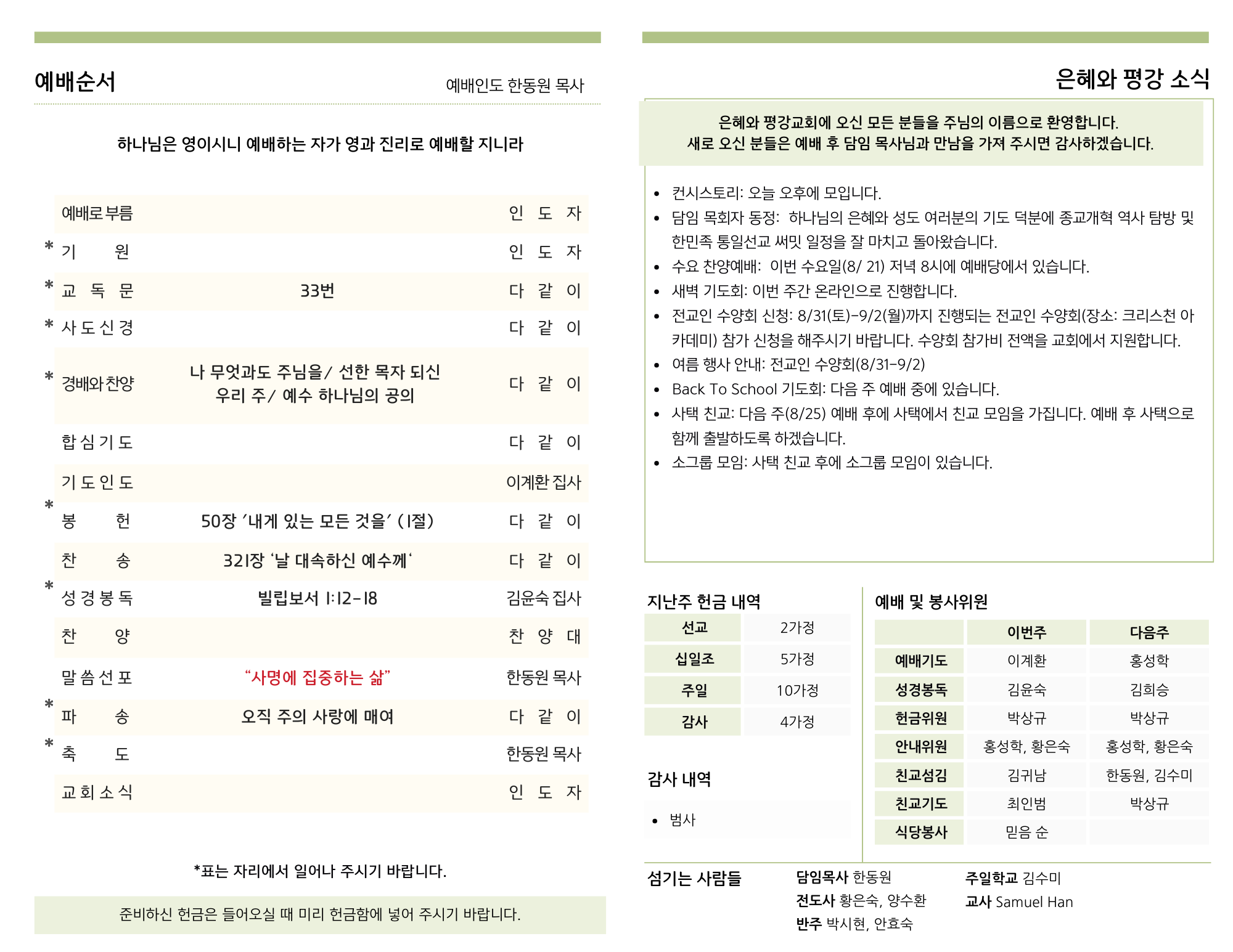 - 사택 친교: 다음 주(8/25) 예배 후에 사택에서 친교 모임을 가집니다. 예배 후 사택으로 함께 출발하도록 하겠습니다.