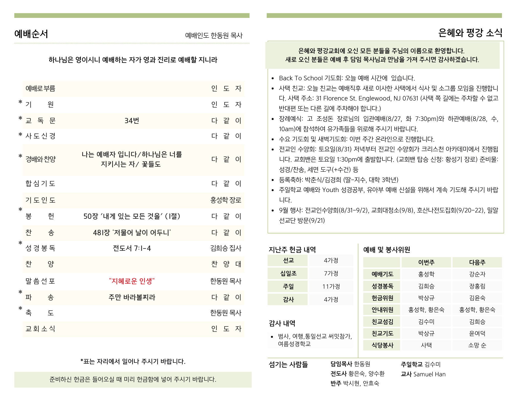 • 전교인 수양회: 토요일(8/31) 저녁부터 전교인 수양회가 크리스천 아카데미에서 진행됩니다. 교회밴은 토요일 1:30pm에 출발합니다. (교회밴 탑승 신청: 황성기 장로) 준비물: 성경/찬송, 세면 도구(+수건) 등
