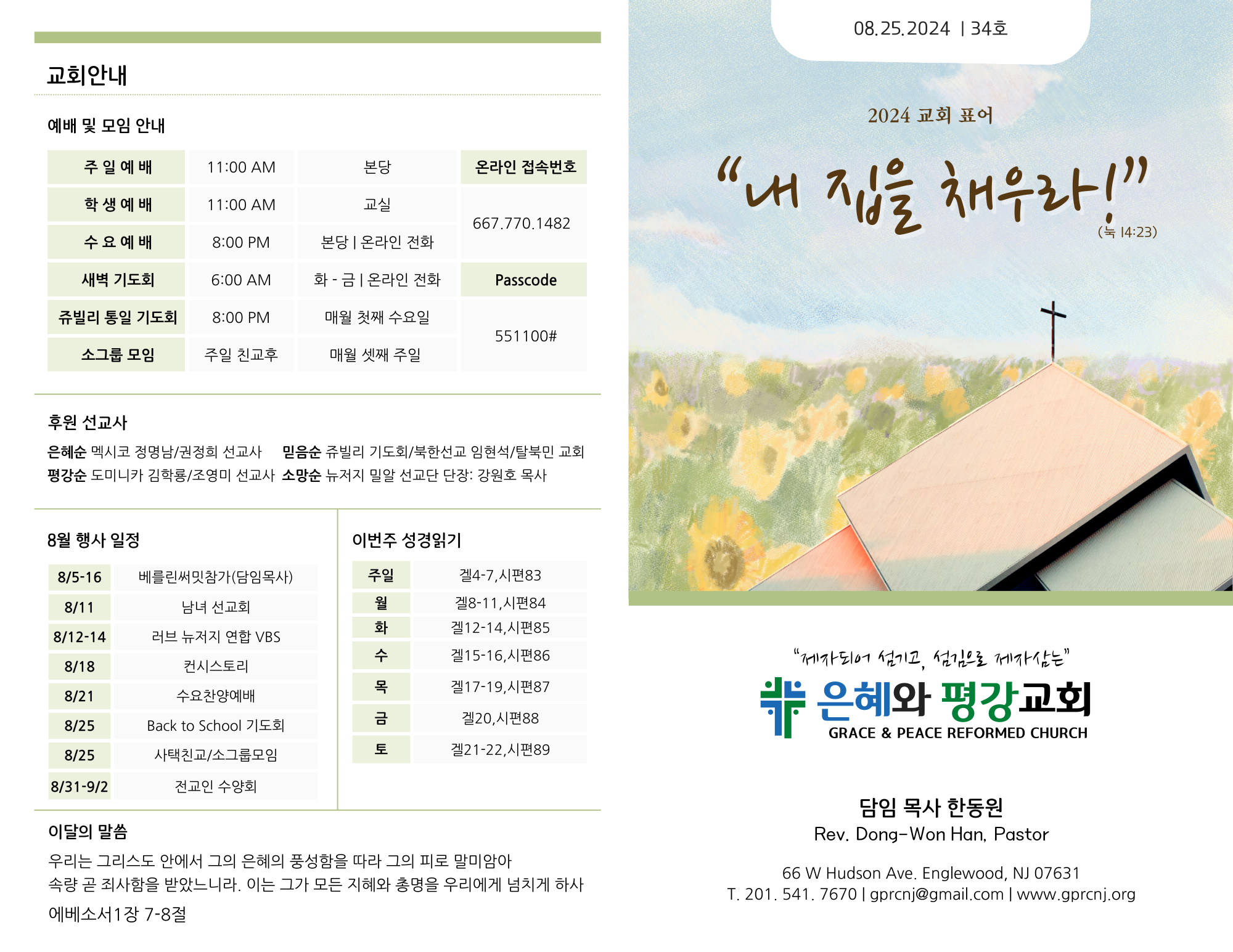 • 사택 친교: 오늘 친교는 예배직후 새로 이사한 사택에서 식사 및 소그룹 모임을 진행합니다. 사택 주소: 31 Florence St. Englewood, NJ 07631 (사택 쪽 길에는 주차할 수 없고 반대편 또는 다른 길에 주차해야 합니다.)