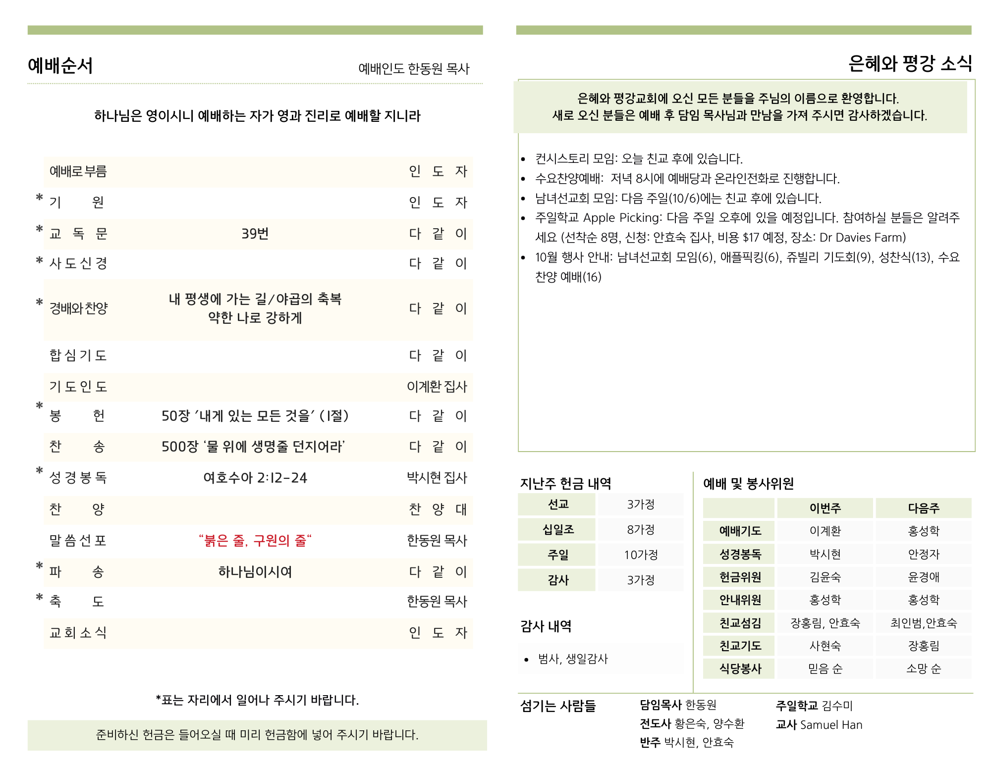 - 남녀선교회 모임: 다음 주일(10/6)에는 친교 후에 있습니다.