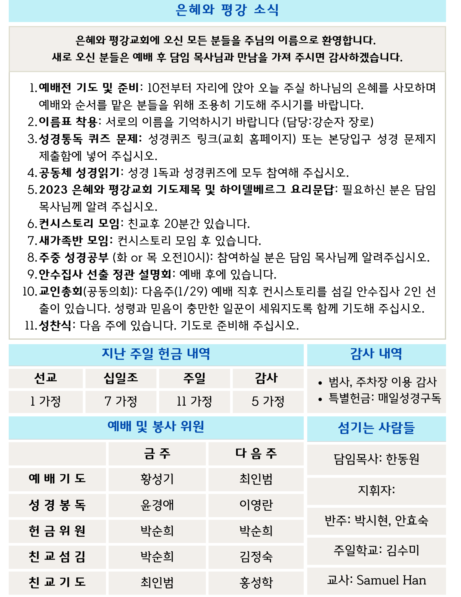 온라인 주보 1.22.23 by kara1103 2023. 1. 22. 공유하기 게시글 관리 은혜와 평강 교회 '온라인 주보' 카테고리의 다른 글 2.5.23 (0) 2023.02.05 1.29.23 (0) 2023.01.29 1.15.23 (0) 2023.01.15 1.8.23 (0) 2023.01.08 1.1.23 주보 (0) 2023.01.02 관련글 2.5.23 1.29.23 1.15.23 1.8.23 댓글