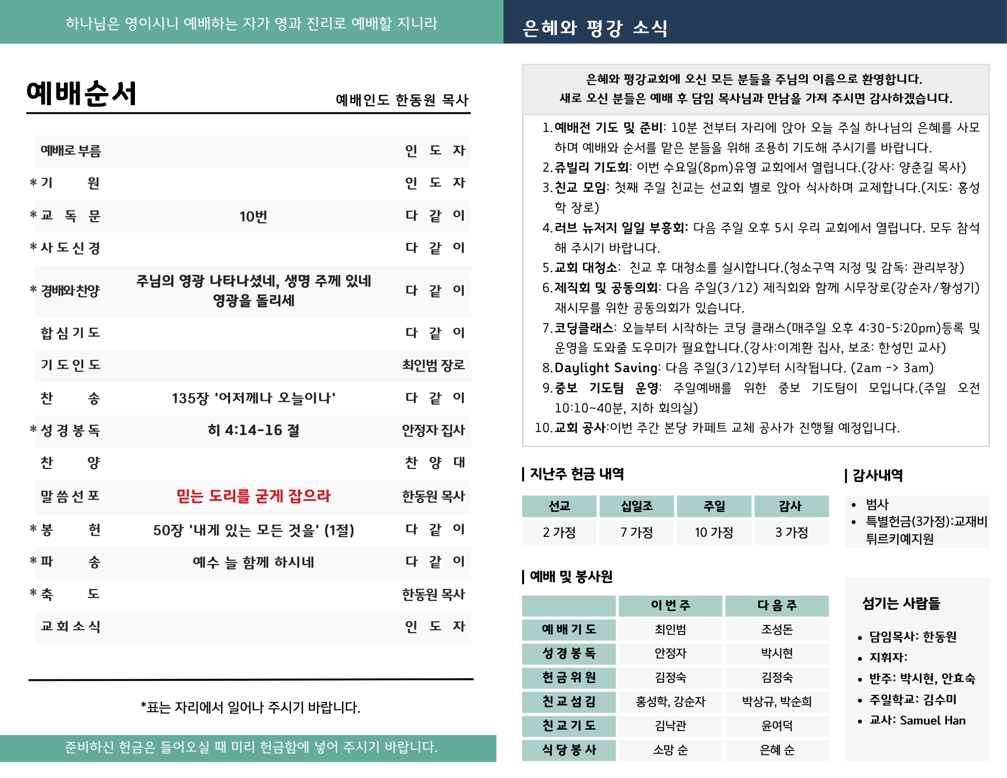 6.제직회 및 공동의회: 다음 주일(3/12) 제직회와 함께 시무장로(강순자/황성기)재시무를 위한 공동의회가 있습니다.