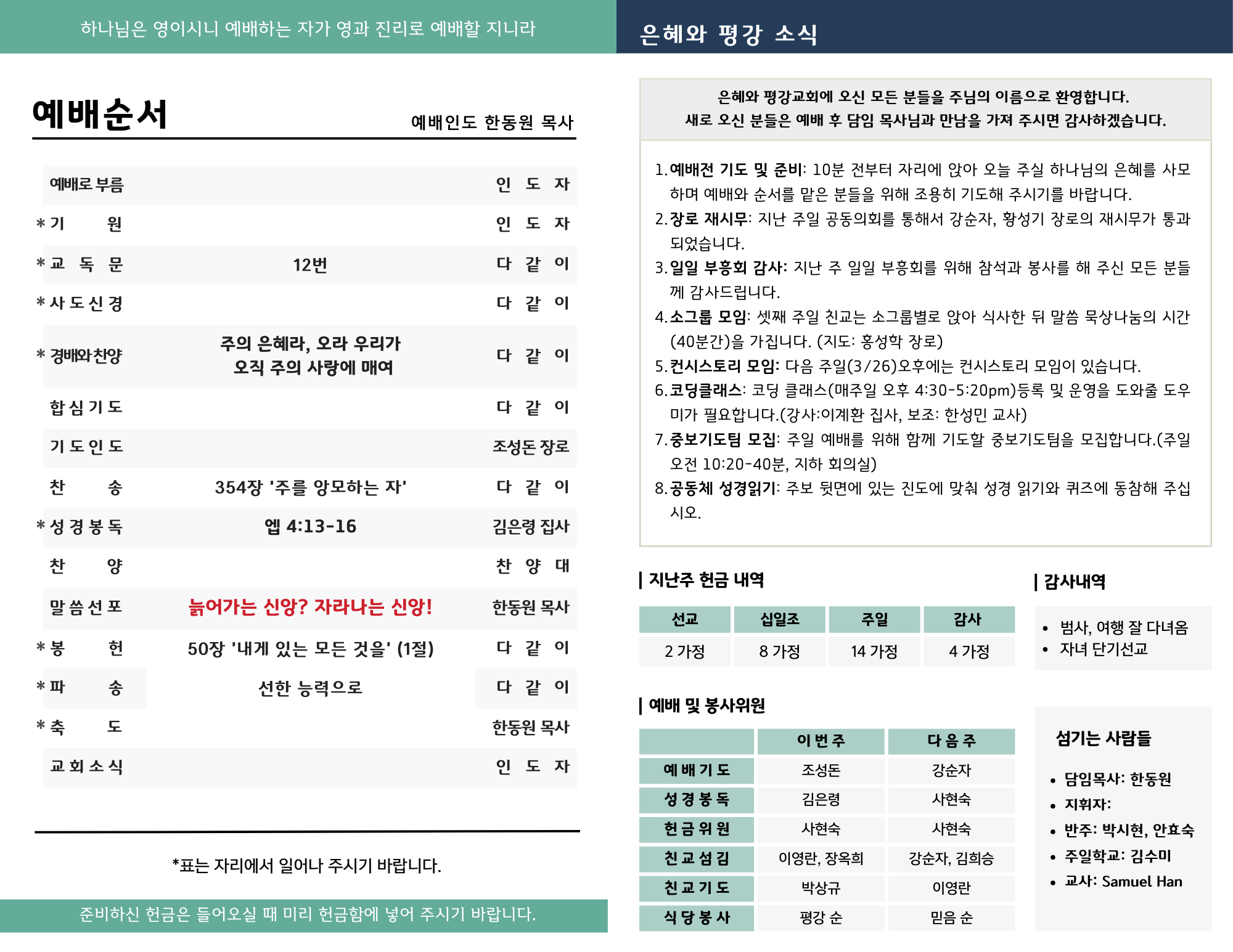 - 예배전 기도 및 준비: 10분 전부터 자리에 앉아 오늘 주실 하나님의 은혜를 사모하며 예배와 순서를 맡은 분들을 위해 조용히 기도해 주시기를 바랍니다.