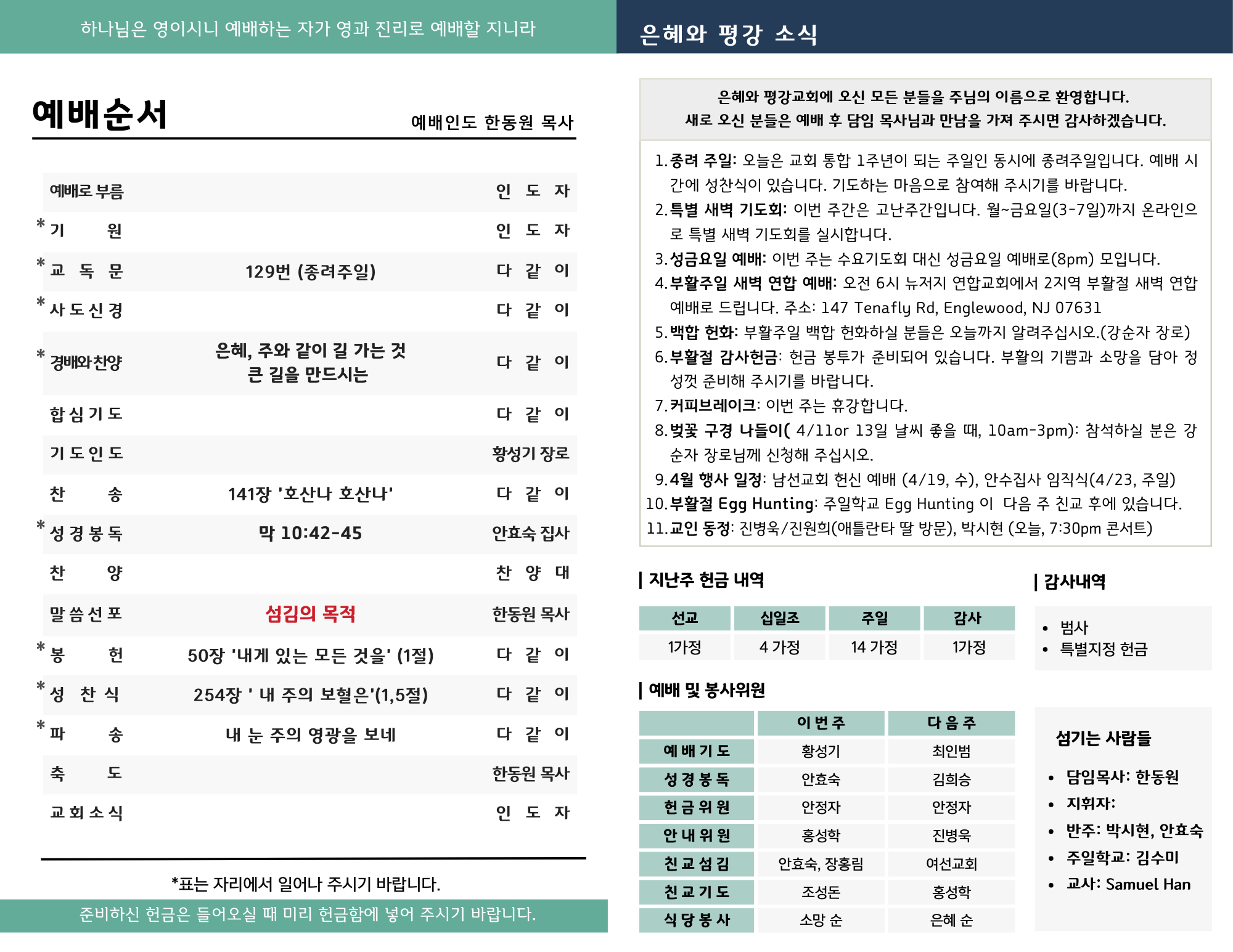 - 부활절 감사헌금: 헌금 봉투가 준비되어 있습니다. 부활의 기쁨과 소망을 담아 정성껏 준비해 주시기를 바랍니다.